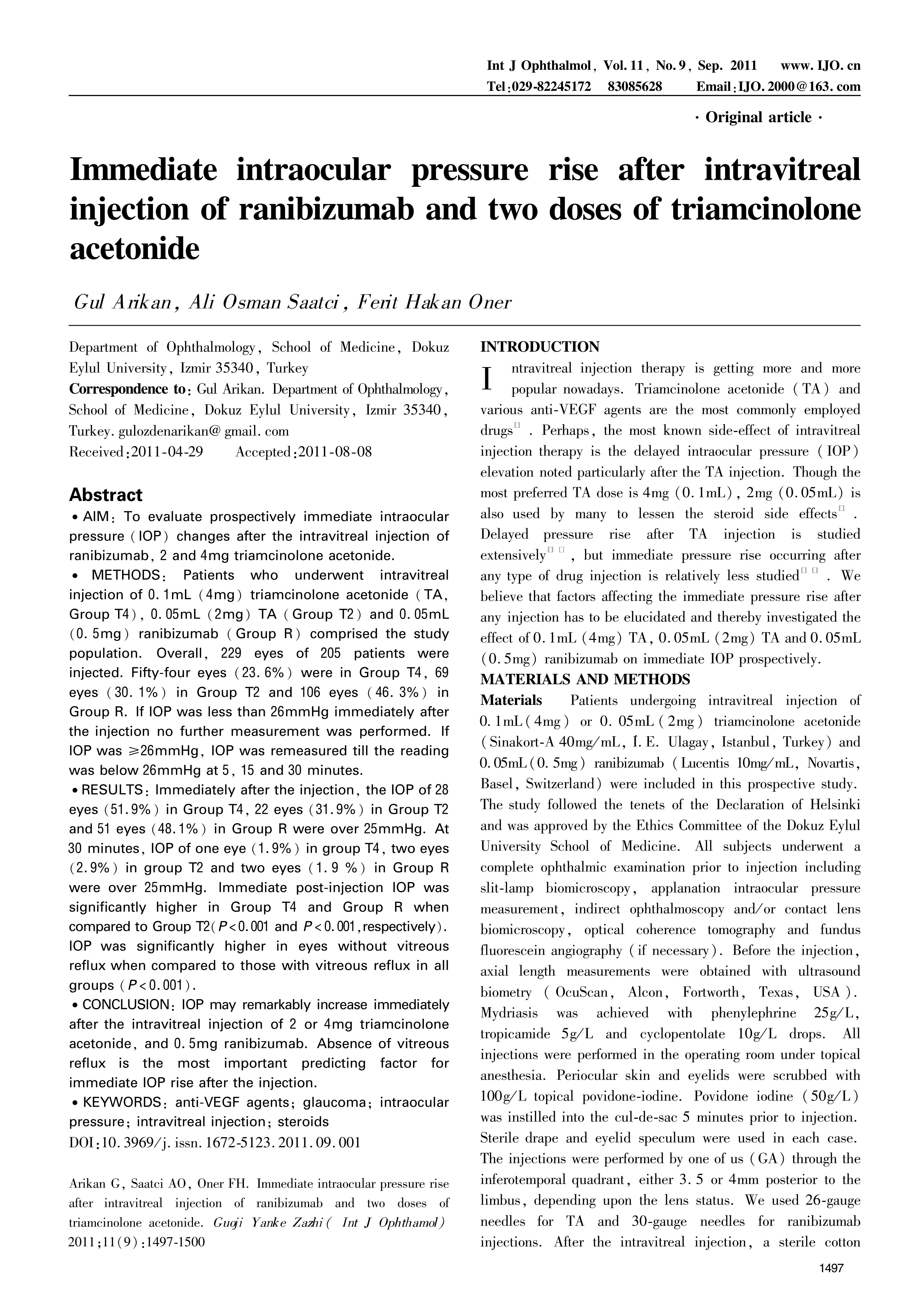 目的:前瞻性评估玻璃体腔内注射兰尼单抗、2和4mg曲安奈德(TA)后眼压(IOP)的即时变化。方法:接受玻璃体腔内注射0.1mL(4mg)曲安奈德(T4组),0.05mL(2mg)TA(T2组)和0.05mL(0.5mg)兰尼单抗(R组)的患者组成研究群体。总体而言,205例229眼接受注射。T4组54眼(23.6%),T2组69眼(30.1%),及R组106眼(46.3%)。如果注射后即时眼压<26mmHg就不行进一步的测量。如果眼压≥26mmHg,就在5,15和30min后重新测量眼压,直到读数<26mmHg。结果:注射后即时眼压,T4组28眼(51.9%),T2组22眼(31.9%)和R组51眼(48.1%)超过25mmHg。到30min时,T4组1眼(1.9%),T2组2眼(2.9%)和R组2眼(1.9%),眼压超过25mmHg。T4组和R组注射后即时眼压显著高于T2组(P<0.01和P<0.01)。各组中无玻璃体回流眼的眼压显著高于有玻璃体回流眼(P<0.01)。结论:玻璃体腔内注射2或4mg曲安奈德和0.5mg的兰尼单抗后眼压可能会立即显著提高。无玻璃体回流是注射后眼压即时上升的最重要的预测因素。