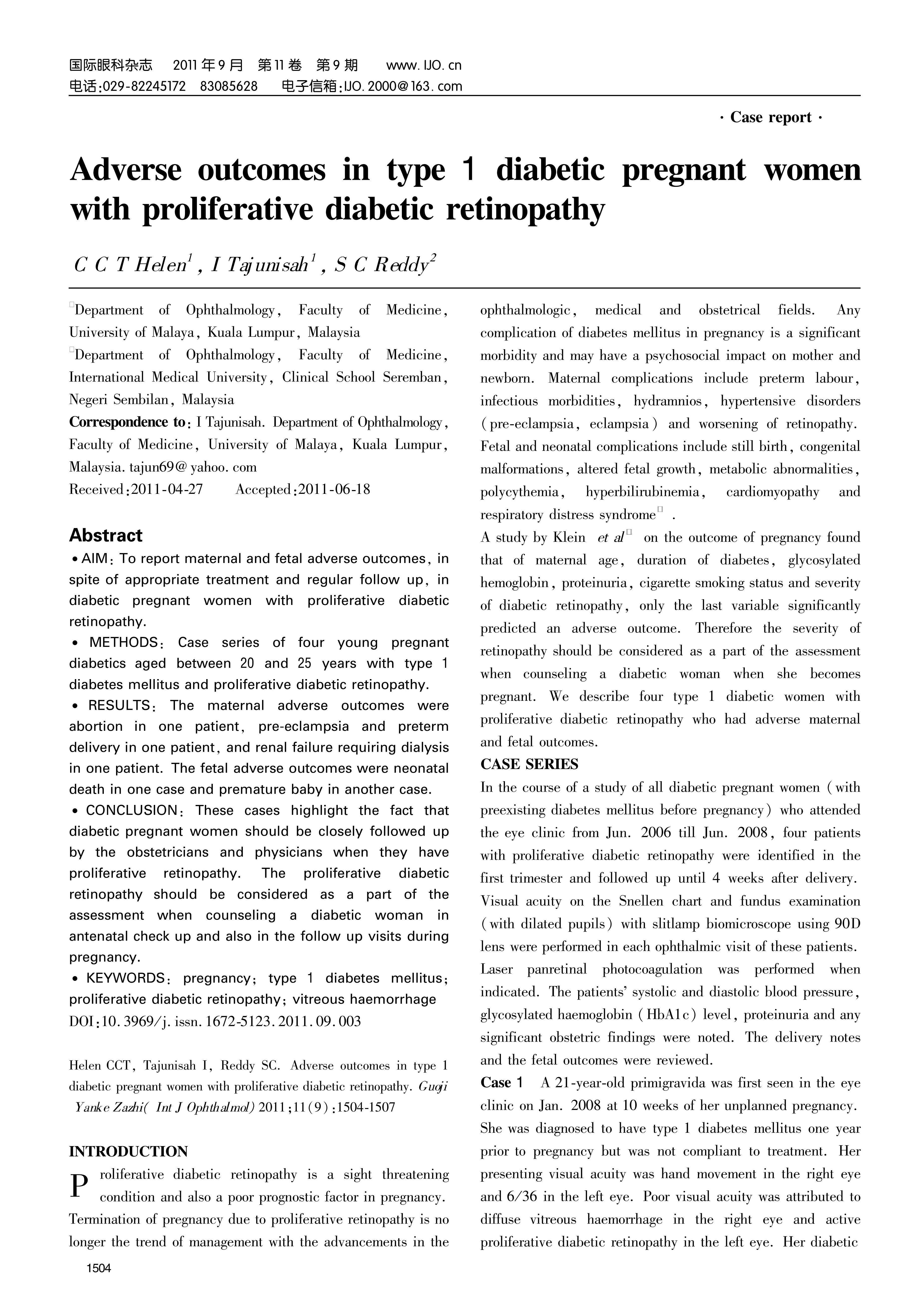 AIM:To report maternal and fetal adverse outcomes,in spite of appropriate treatment and regular follow up,in diabetic pregnant women with proliferative diabetic retinopathy.METHODS:Case series of four young pregnant diabetics aged between 20 and 25 years with type 1 diabetes mellitus and proliferative diabetic retinopathy.RESULTS:The maternal adverse outcomes were abortion in one patient,pre-eclampsia and preterm delivery in one patient,and renal failure requiring dialysis in one patient.The fetal adverse outcomes were neonatal death in one case and premature baby in another case.CONCLUSION:These cases highlight the fact that diabetic pregnant women should be closely followed up by the obstetricians and physicians when they have proliferative retinopathy.The proliferative diabetic retinopathy should be considered as a part of the assessment when counseling a diabetic woman in antenatal check up and also in the follow up visits during pregnancy.