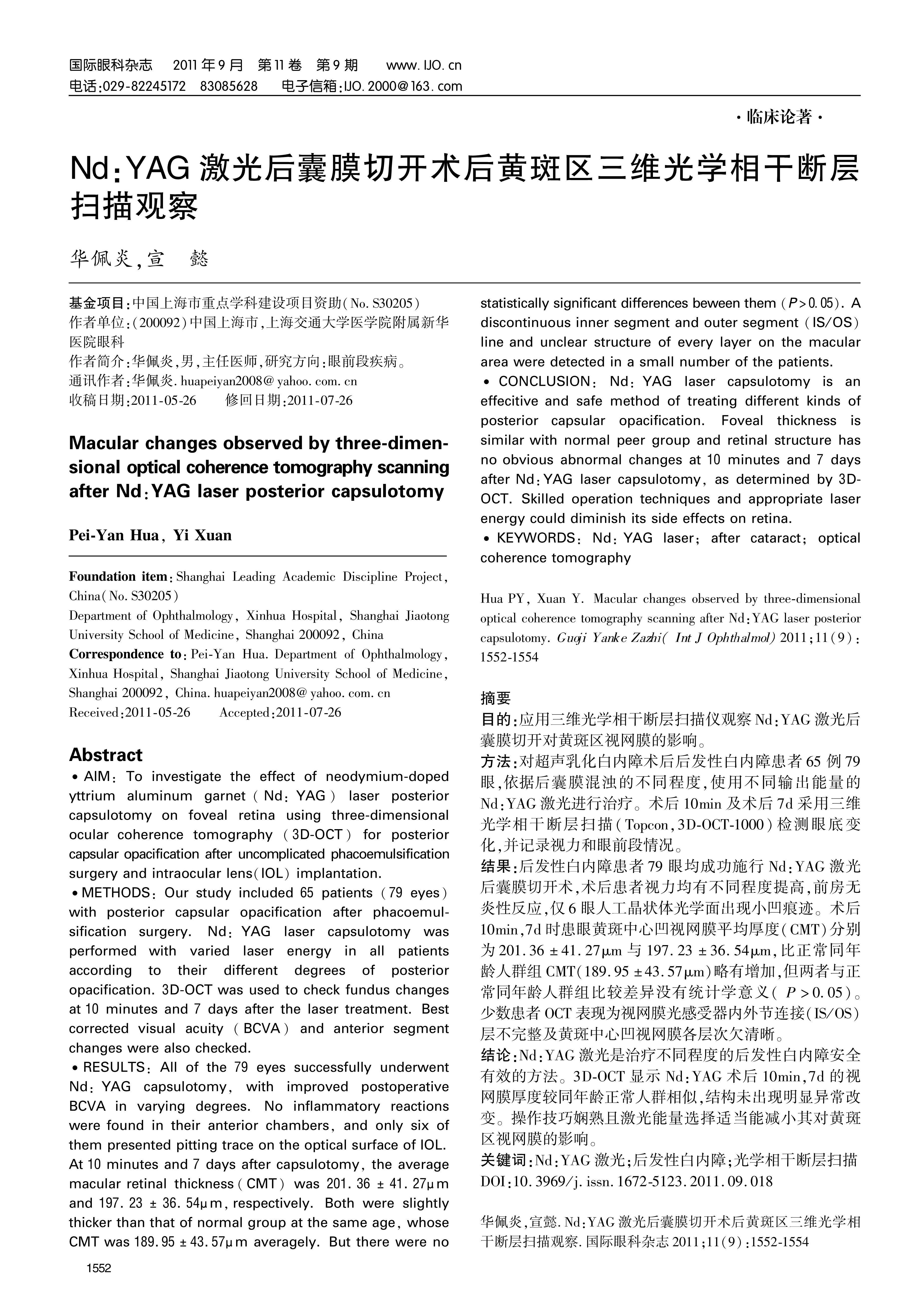 AIM:To investigate the effect of neodymium-doped yttrium aluminum garnet(Nd:YAG) laser posterior capsulotomy on foveal retina using three-dimensional ocular coherence tomography(3D-OCT) for posterior capsular opacification after uncomplicated phacoemulsification surgery and intraocular lens(IOL) implantation.METHODS:Our study included 65 patients(79 eyes) with posterior capsular opacification after phacoemul-sification surgery.Nd:YAG laser capsulotomy was performed with varied laser energy in all patients according to their different degrees of posterior opacification.3D-OCT was used to check fundus changes at 10 minutes and 7 days after the laser treatment.Best corrected visual acuity(BCVA) and anterior segment changes were also checked.RESULTS:All of the 79 eyes successfully underwent Nd:YAG capsulotomy,with improved postoperative BCVA in varying degrees.No inflammatory reactions were found in their anterior chambers,and only six of them presented pitting trace on the optical surface of IOL.At 10 minutes and 7 days after capsulotomy,the average macular retinal thickness(CMT) was 201.36±41.27μm and 197.23±36.54μm,respectively.Both were slightly thicker than that of normal group at the same age,whose CMT was 189.95±43.57μm averagely.But there were no statistically significant differences beween them(P>0.05).A discontinuous inner segment and outer segment(IS/OS) line and unclear structure of every layer on the macular area were detected in a small number of the patients.CONCLUSION:Nd:YAG laser capsulotomy is an effecitive and safe method of treating different kinds of posterior capsular opacification.Foveal thickness is similar with normal peer group and retinal structure has no obvious abnormal changes at 10 minutes and 7 days after Nd:YAG laser capsulotomy,as determined by 3D-OCT.Skilled operation techniques and appropriate laser energy could diminish its side effects on retina.