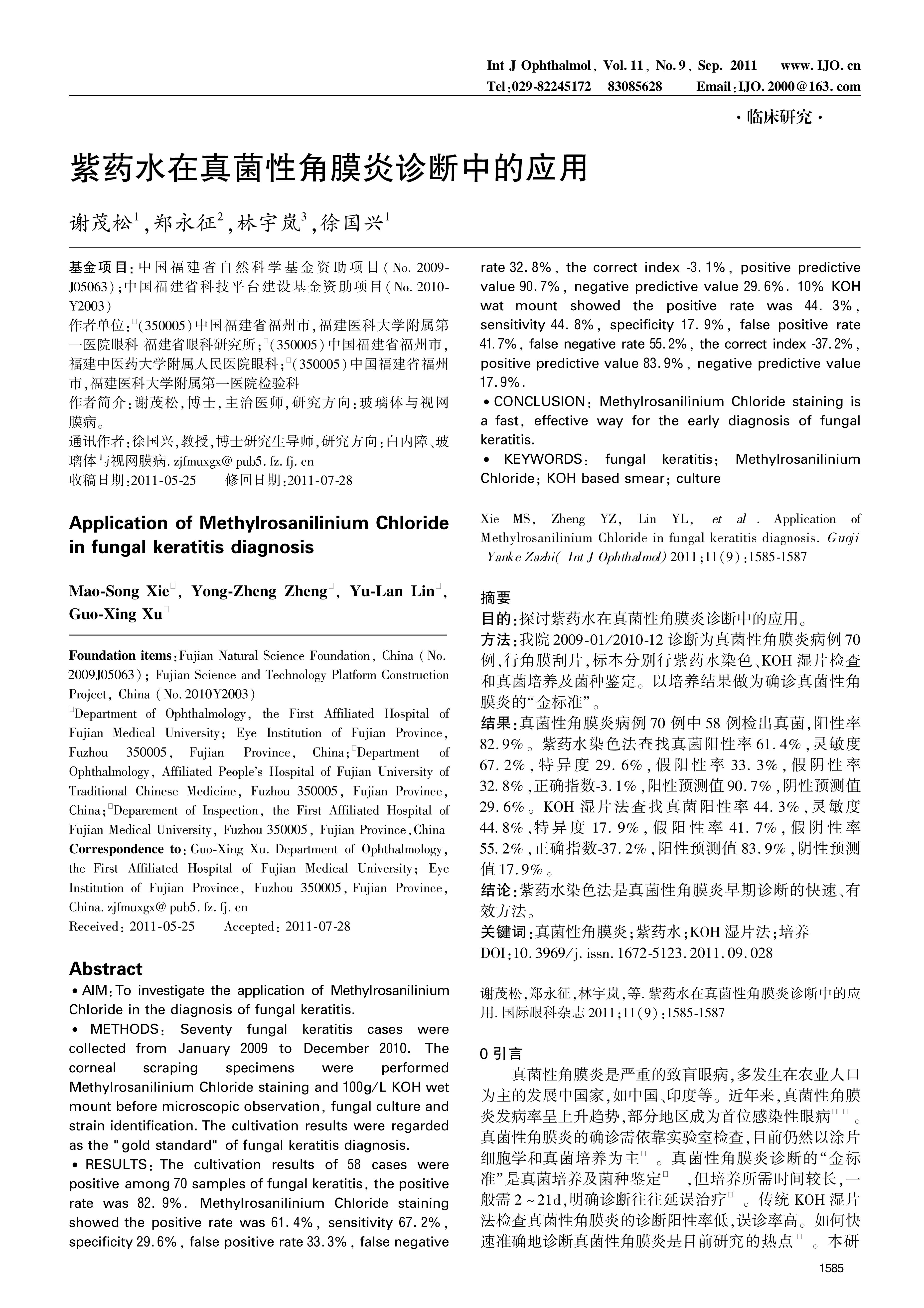 AIM:To investigate the application of Methylrosanilinium Chloride in the diagnosis of fungal keratitis.METHODS:Seventy fungal keratitis cases were collected from January 2009 to December 2010.The corneal scraping specimens were performed Methylrosanilinium Chloride staining and 100g/L KOH wet mount before microscopic observation,fungal culture and strain identification.The cultivation results were regarded as the "gold standard" of fungal keratitis diagnosis.RESULTS:The cultivation results of 58 cases were positive among 70 samples of fungal keratitis,the positive rate was 82.9%.Methylrosanilinium Chloride staining showed the positive rate was 61.4%,sensitivity 67.2%,specificity 29.6%,false positive rate 33.3%,false negative rate 32.8%,the correct index-3.1%,positive predictive value 90.7%,negative predictive value 29.6%.10% KOH wat mount showed the positive rate was 44.3%,sensitivity 44.8%,specificity 17.9%,false positive rate 41.7%,false negative rate 55.2%,the correct index-37.2%,positive predictive value 83.9%,negative predictive value 17.9%.CONCLUSION:Methylrosanilinium Chloride staining is a fast,effective way for the early diagnosis of fungal keratitis.