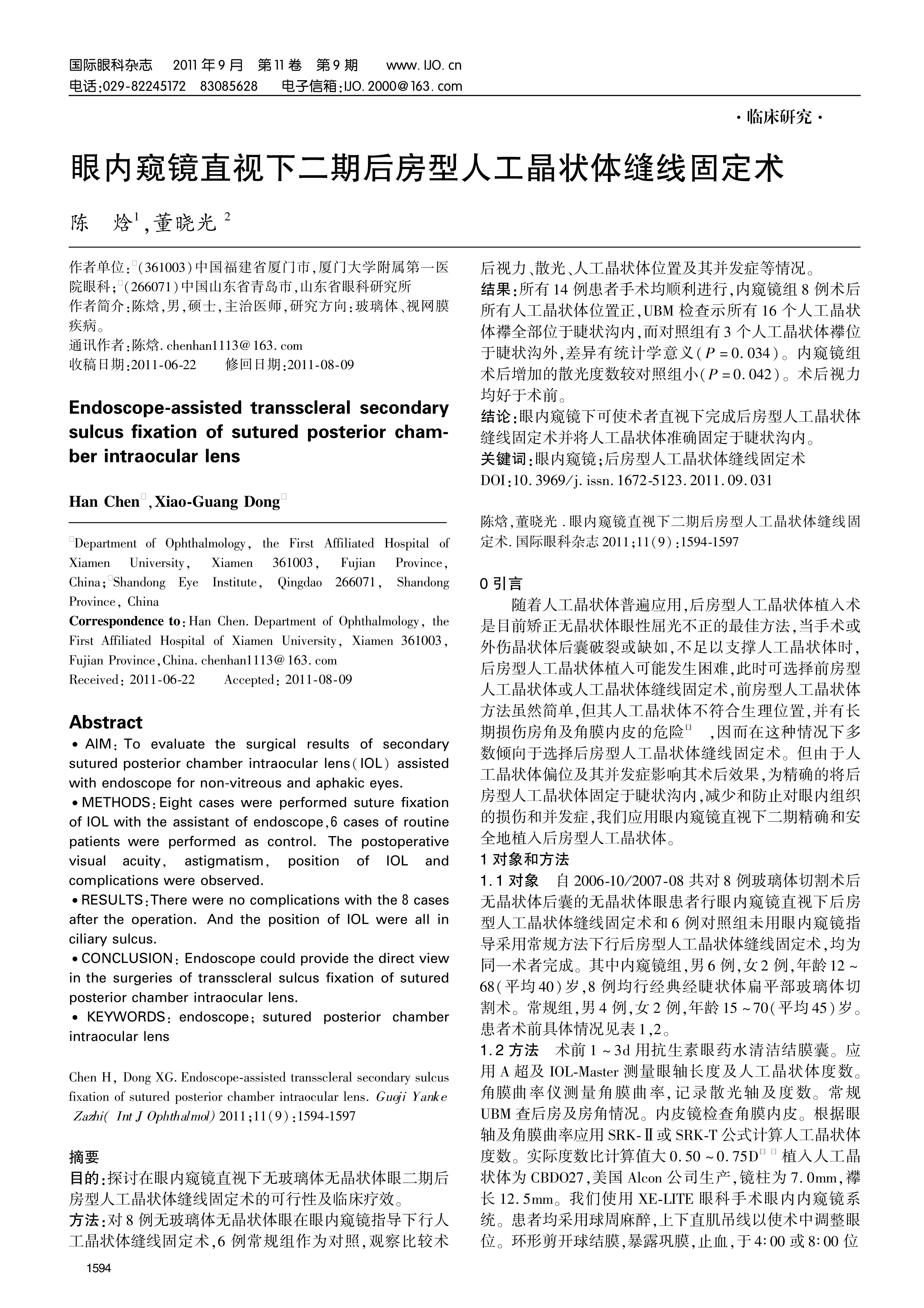 AIM:To evaluate the surgical results of secondary sutured posterior chamber intraocular lens(IOL) assisted with endoscope for non-vitreous and aphakic eyes.METHODS:Eight cases were performed suture fixation of IOL with the assistant of endoscope,6 cases of routine patients were performed as control.The postoperative visual acuity,astigmatism,position of IOL and complications were observed.RESULTS:There were no complications with the 8 cases after the operation.And the position of IOL were all in ciliary sulcus.CONCLUSION:Endoscope could provide the direct view in the surgeries of transscleral sulcus fixation of sutured posterior chamber intraocular lens.