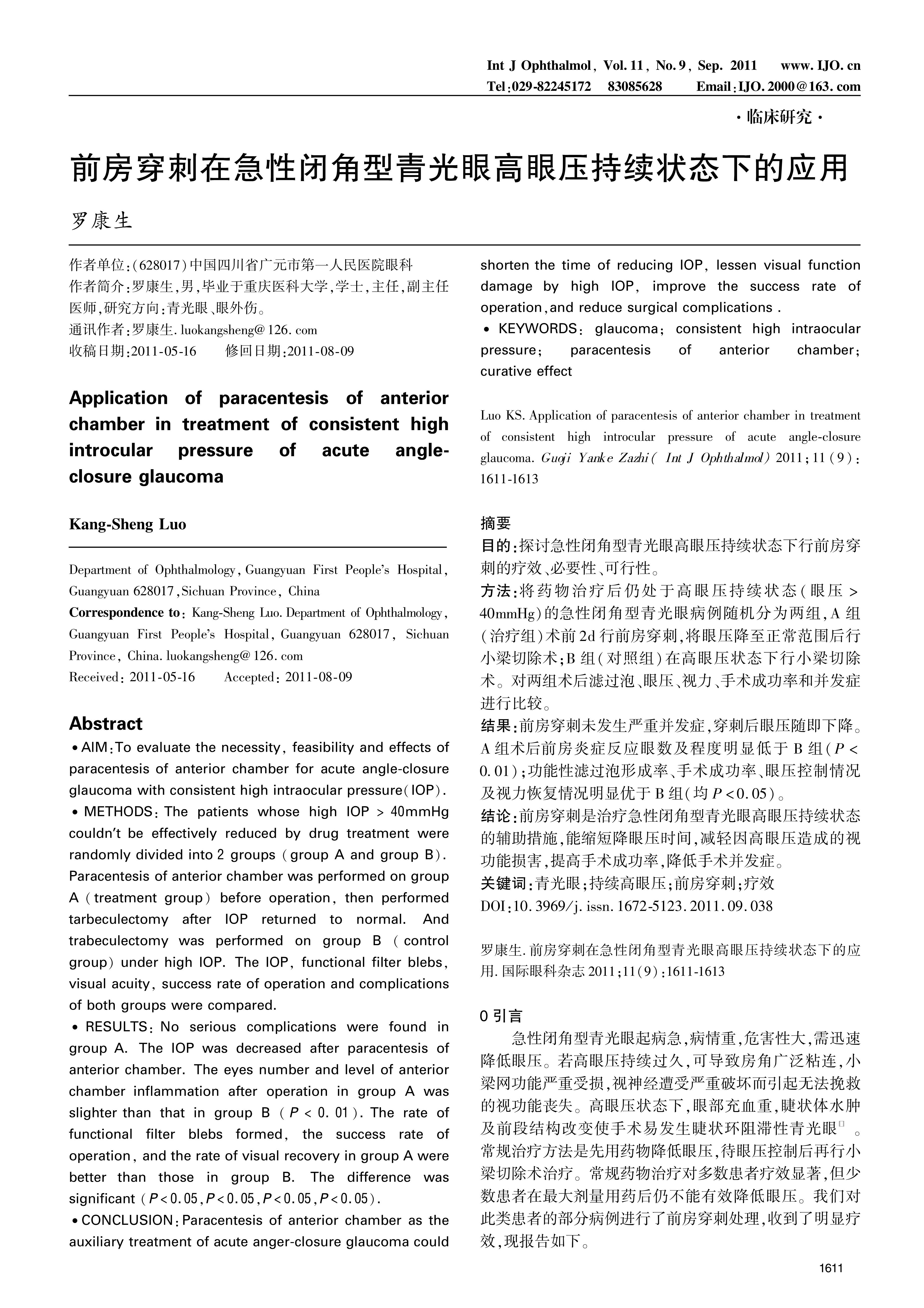 AIM:To evaluate the necessity,feasibility and effects of paracentesis of anterior chamber for acute angle-closure glaucoma with consistent high intraocular pressure(IOP).METHODS:The patients whose high IOP>40mmHg couldn’t be effectively reduced by drug treatment were randomly divided into 2 groups(group A and group B).Paracentesis of anterior chamber was performed on group A(treatment group) before operation,then performed tarbeculectomy after IOP returned to normal.And trabeculectomy was performed on group B(control group) under high IOP.The IOP,functional filter blebs,visual acuity,success rate of operation and complications of both groups were compared.RESULTS:No serious complications were found in group A.The IOP was decreased after paracentesis of anterior chamber.The eyes number and level of anterior chamber inflammation after operation in group A was slighter than that in group B(P<0.01).The rate of functional filter blebs formed,the success rate of operation,and the rate of visual recovery in group A were better than those in group B.The difference was significant(P<0.05,P<0.05,P<0.05,P<0.05).CONCLUSION:Paracentesis of anterior chamber as the auxiliary treatment of acute anger-closure glaucoma could shorten the time of reducing IOP,lessen visual function damage by high IOP,improve the success rate of operation,and reduce surgical complications.