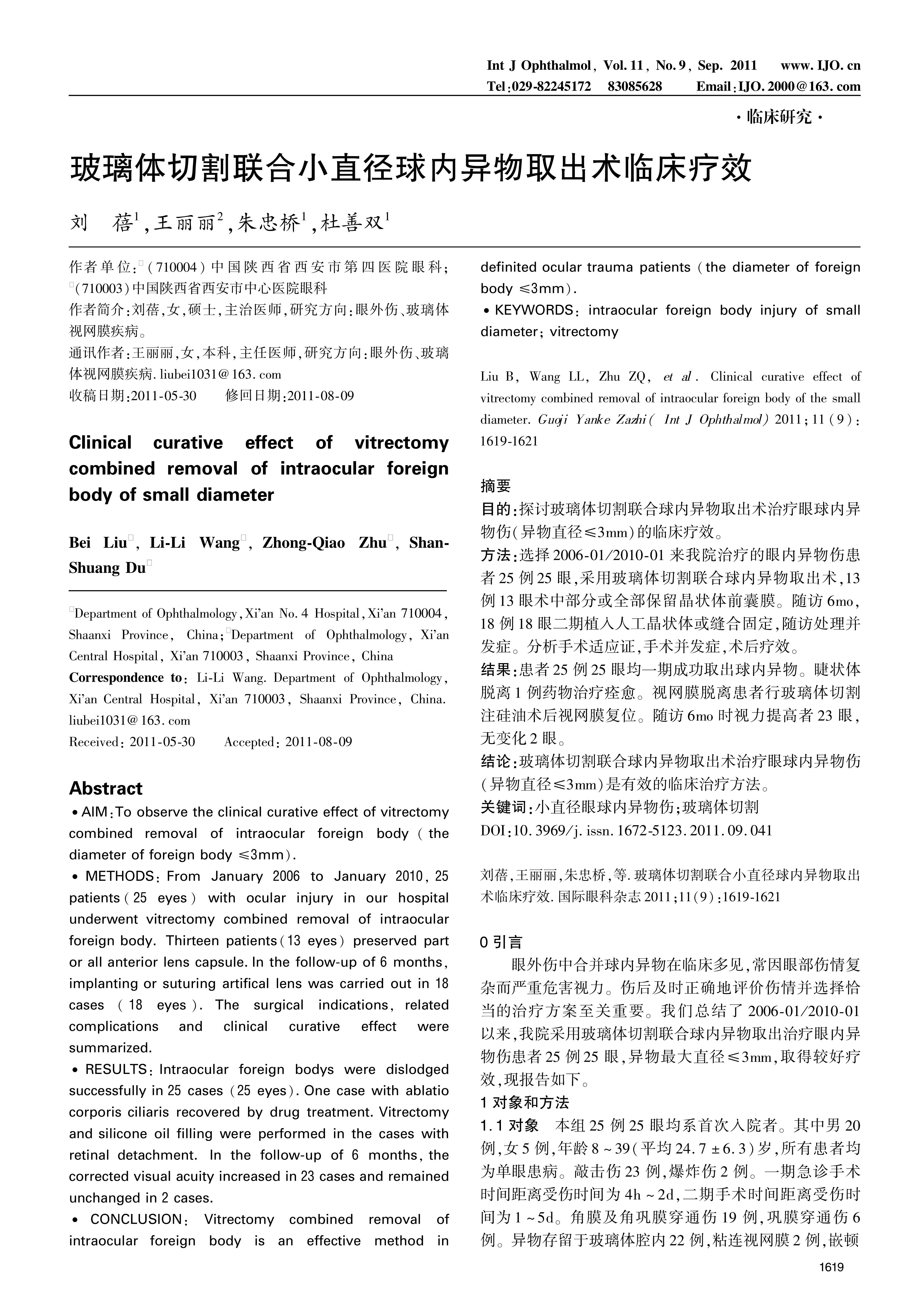 目的:探讨玻璃体切割联合球内异物取出术治疗眼球内异物伤(异物直径≤3mm)的临床疗效。方法:选择2006-01/2010-01来我院治疗的眼内异物伤患者25例25眼,采用玻璃体切割联合球内异物取出术,13例13眼术中部分或全部保留晶状体前囊膜。随访6mo,18例18眼二期植入人工晶状体或缝合固定,随访处理并发症。分析手术适应证,手术并发症,术后疗效。结果:患者25例25眼均一期成功取出球内异物。睫状体脱离1例药物治疗痊愈。视网膜脱离患者行玻璃体切割注硅油术后视网膜复位。随访6mo时视力提高者23眼,无变化2眼。结论:玻璃体切割联合球内异物取出术治疗眼球内异物伤(异物直径≤3mm)是有效的临床治疗方法。