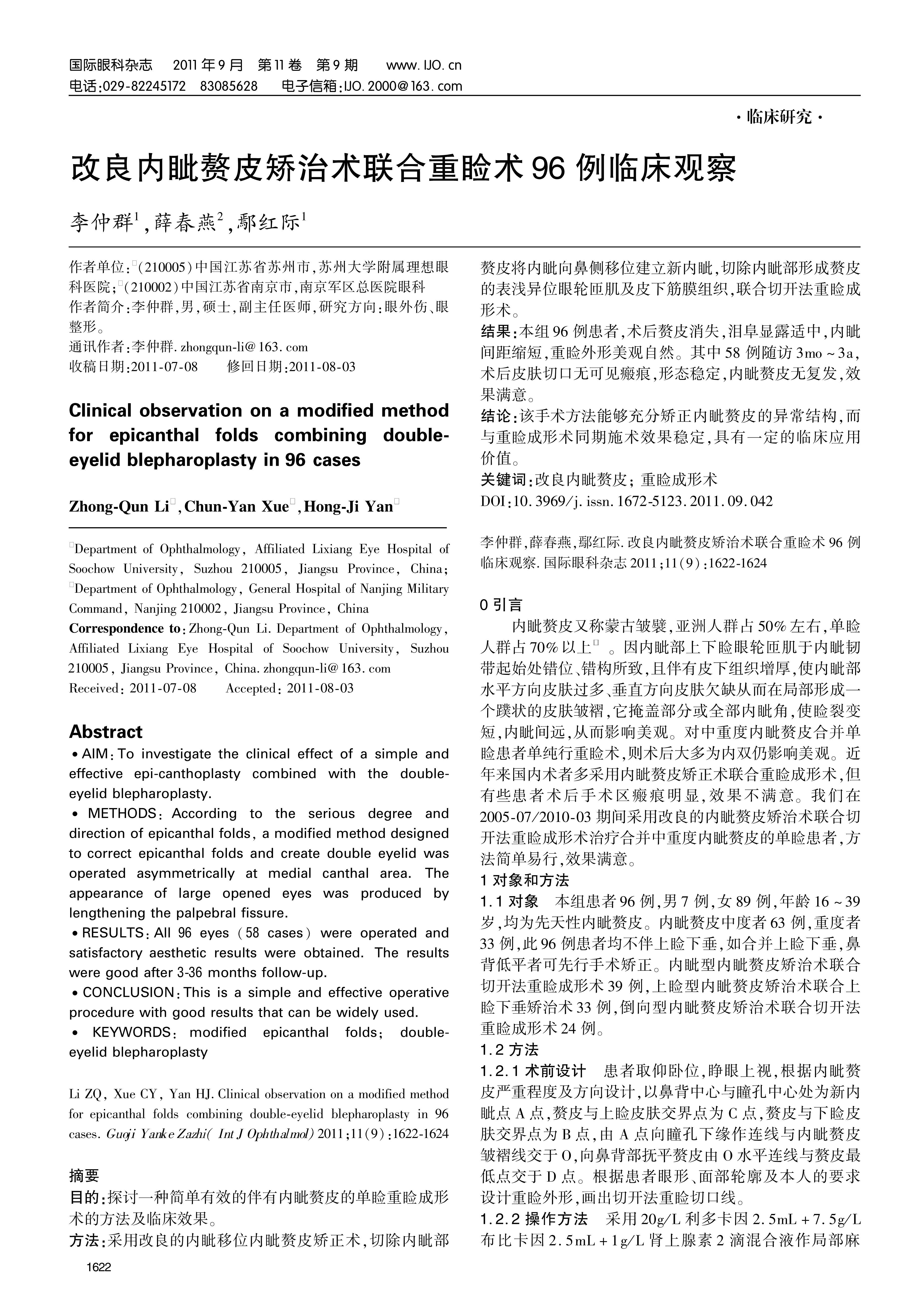 目的:探讨一种简单有效的伴有内眦赘皮的单睑重睑成形术的方法及临床效果。方法:采用改良的内眦移位内眦赘皮矫正术,切除内眦部赘皮将内眦向鼻侧移位建立新内眦,切除内眦部形成赘皮的表浅异位眼轮匝肌及皮下筋膜组织,联合切开法重睑成形术。结果:本组96例患者,术后赘皮消失,泪阜显露适中,内眦间距缩短,重睑外形美观自然。其中58例随访3mo~3a,术后皮肤切口无可见瘢痕,形态稳定,内眦赘皮无复发,效果满意。结论:该手术方法能够充分矫正内眦赘皮的异常结构,而与重睑成形术同期施术效果稳定,具有一定的临床应用价值。