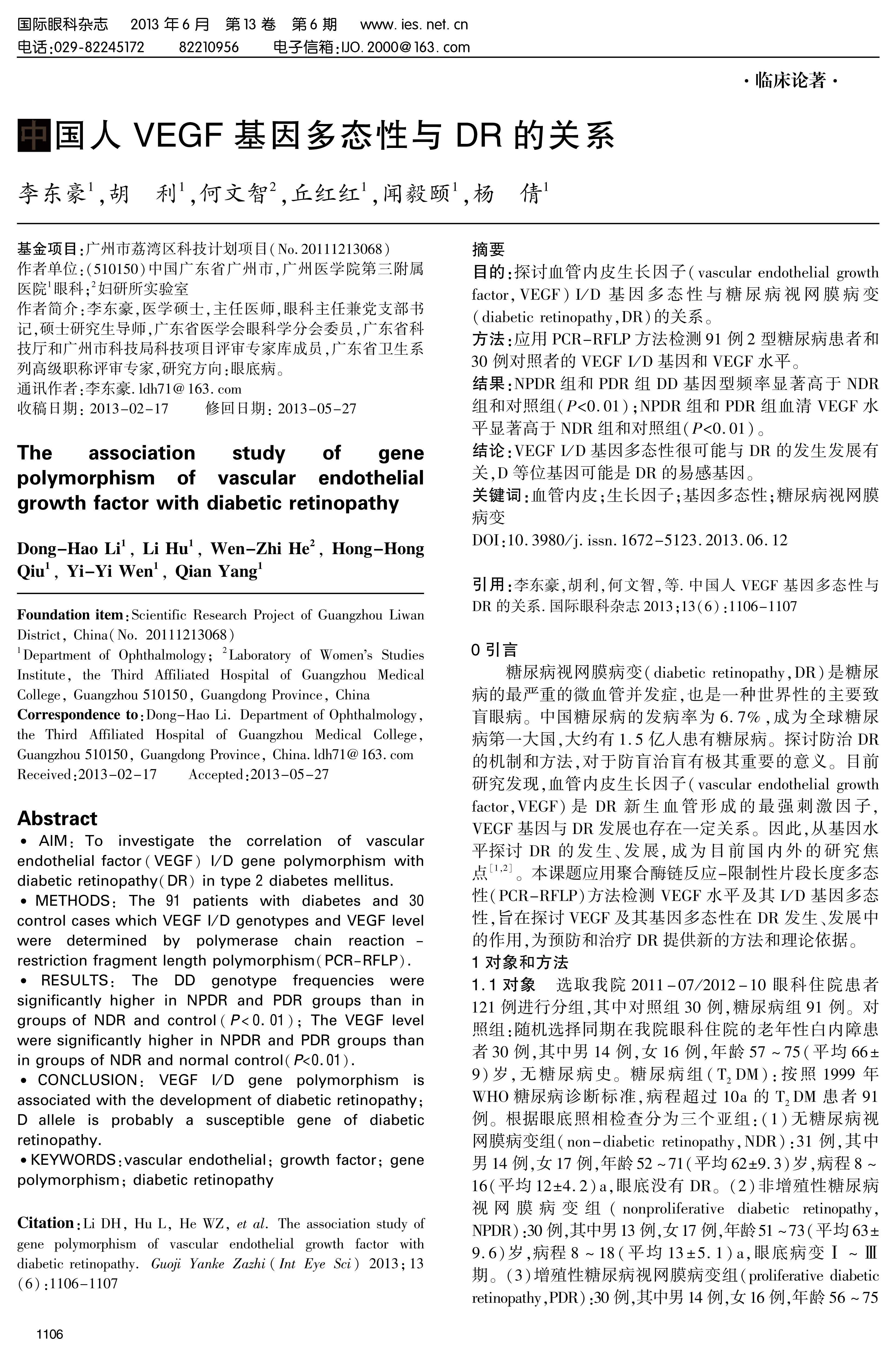 结论:VEGF I/D基因多态性很可能与DR的发生发展有关,D等位基因可能是DR的易感基因。