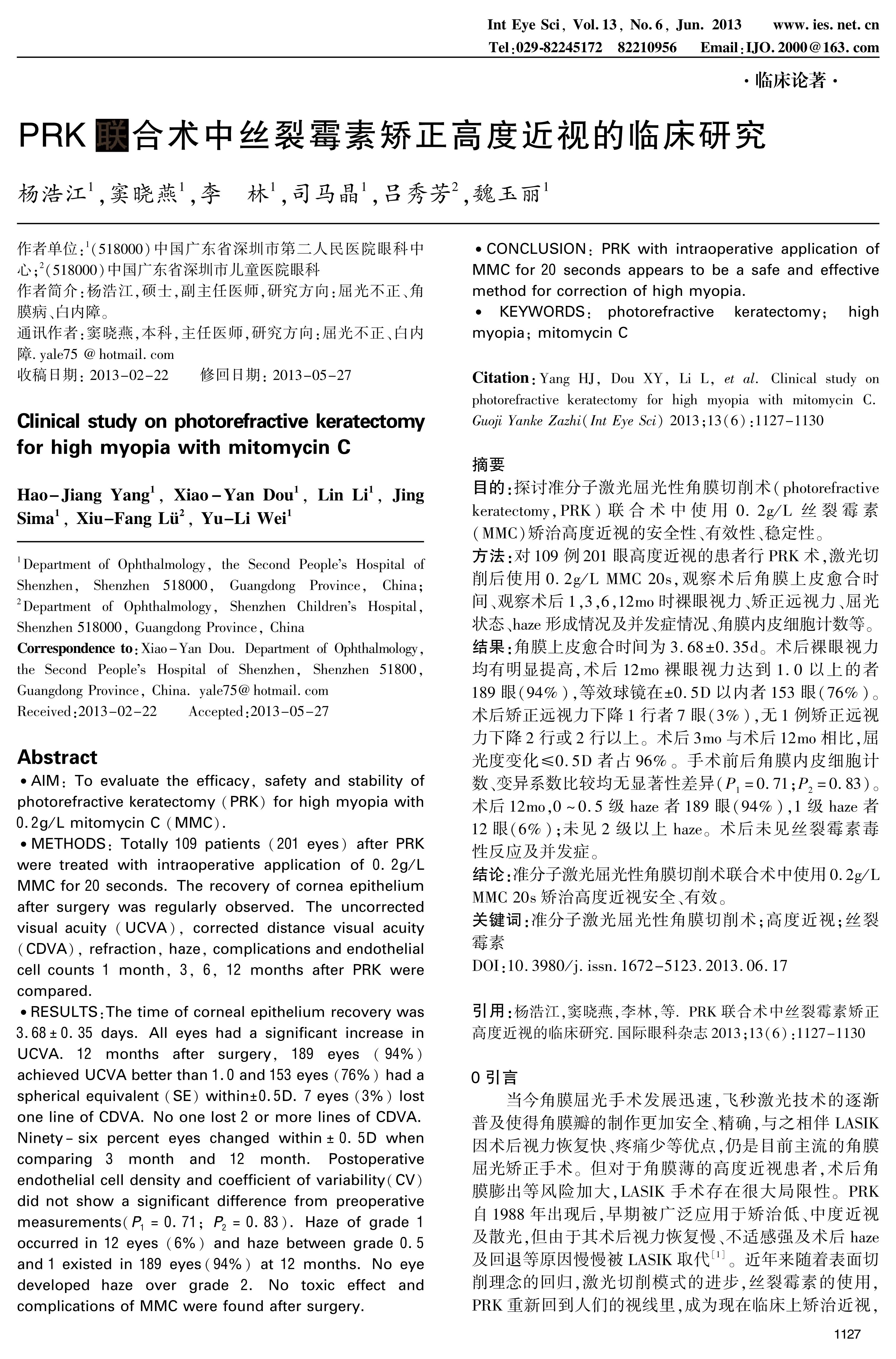 RESULTS:The time of corneal epithelium recovery was 3.68±0.35 days. All eyes had a significant increase in UCVA. 12 months after surgery, 189 eyes(94%)achieved UCVA better than 1.0 and 153 eyes(76%)had a spherical equivalent(SE)within±0.5D. 7 eyes(3%)lost one line of CDVA. No one lost 2 or more lines of CDVA. Ninety-six percent eyes changed within±0.5D when comparing 3 month and 12 month. Postoperative endothelial cell density and coefficient of variability(CV)did not show a significant difference from preoperative measurements(P1=0.71; P2=0.83). Haze of grade 1 occurred in 12 eyes(6%)and haze between grade 0.5 and 1 existed in 189 eyes(94%)at 12 months. No eye developed haze over grade 2. No toxic effect and complications of MMC were found after surgery.