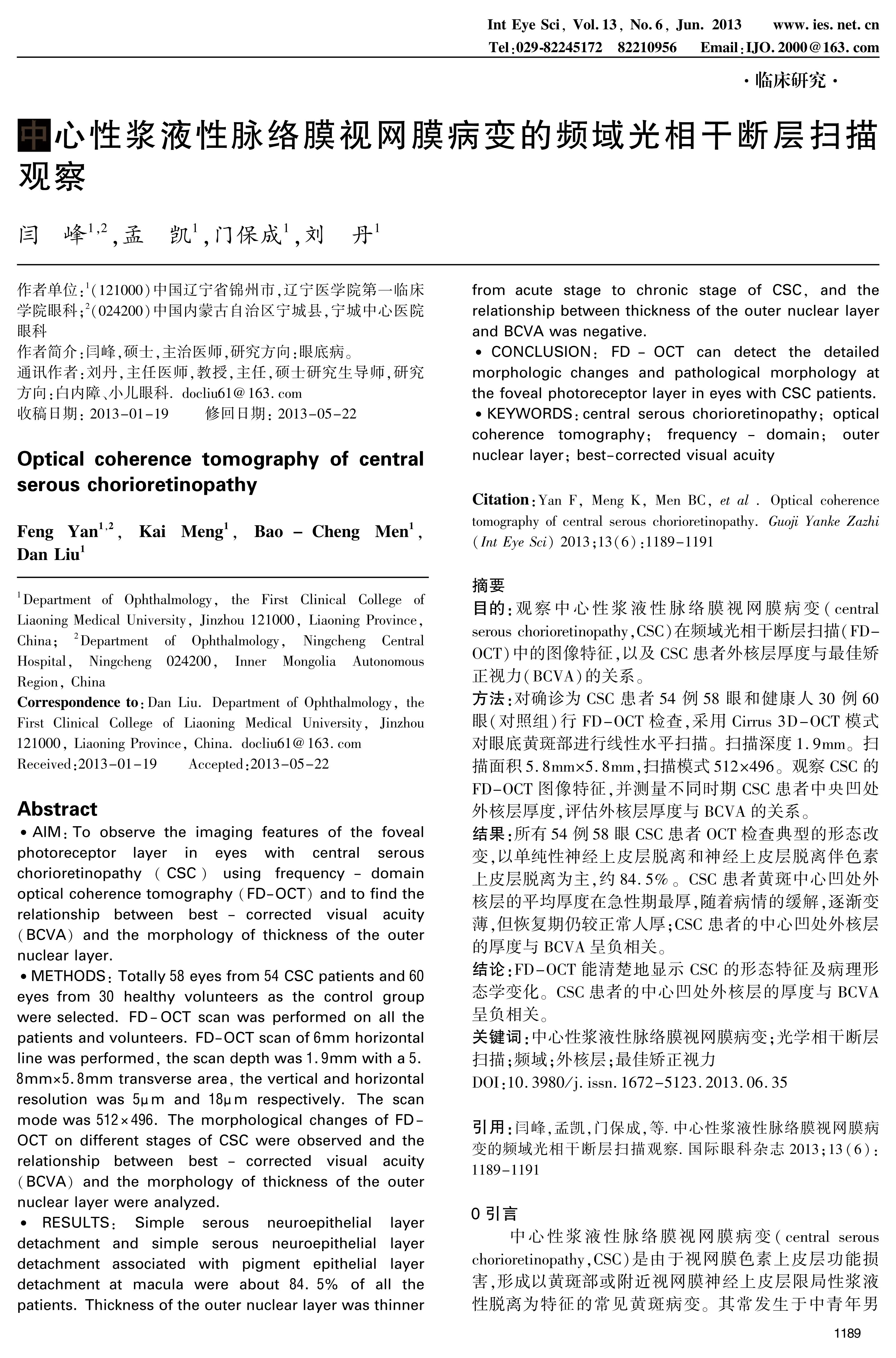 结论:FD-OCT能清楚地显示CSC的形态特征及病理形态学变化。CSC患者的中心凹处外核层的厚度与BCVA呈负相关。
