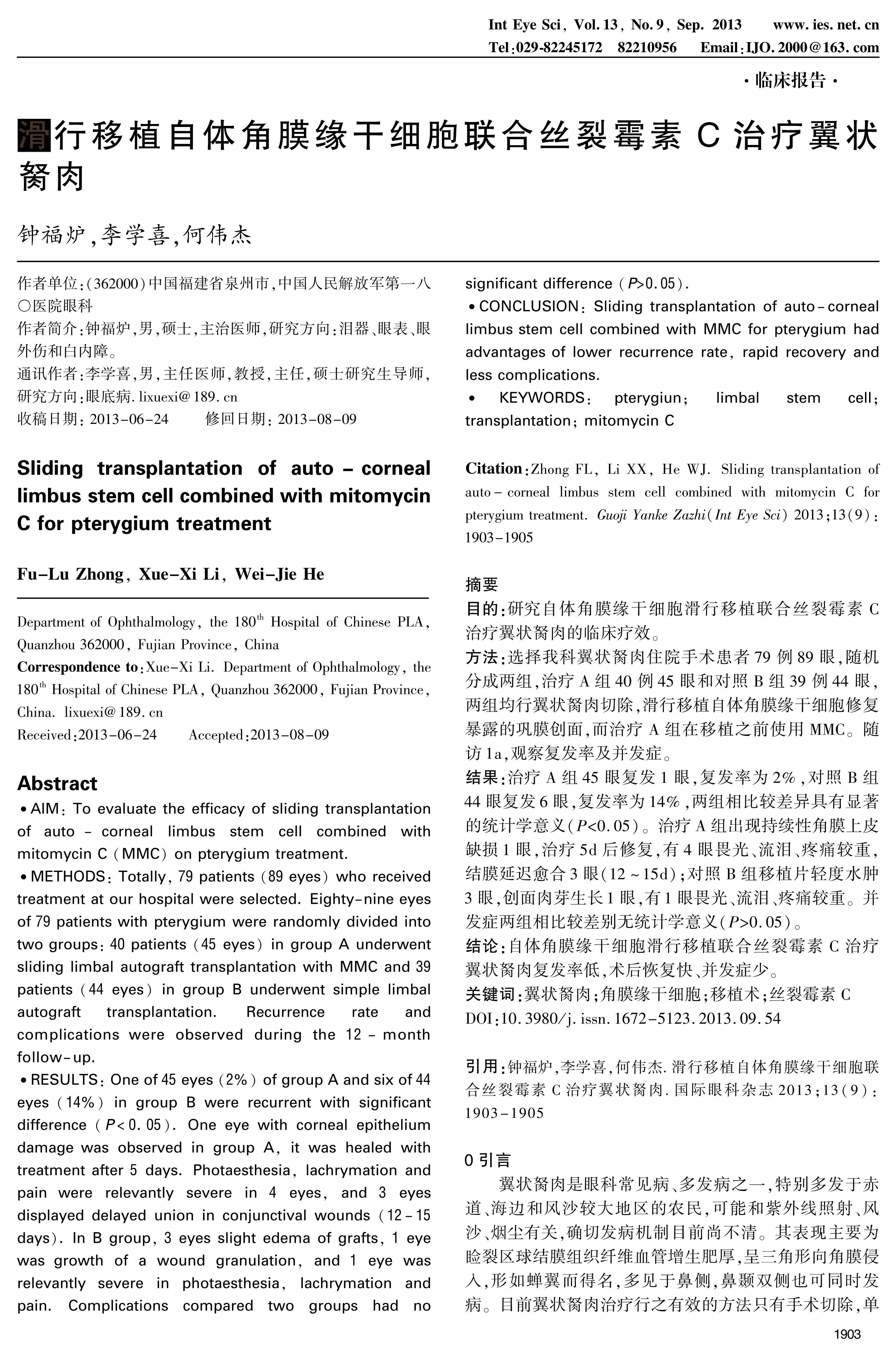 目的:研究自体角膜缘干细胞滑行移植联合丝裂霉素C治疗翼状胬肉的临床疗效。