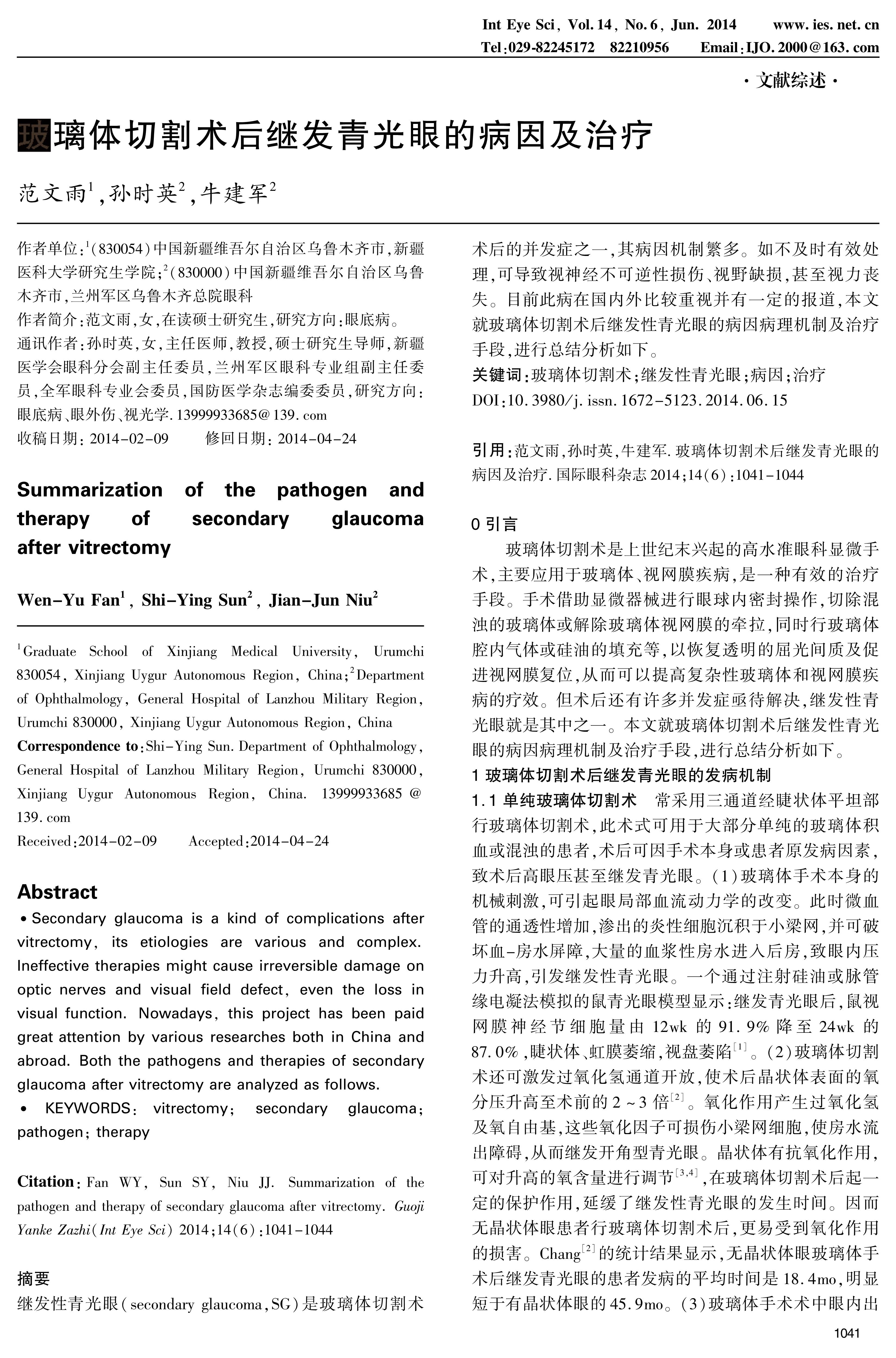 继发性青光眼(secondary glaucoma,SG)是玻璃体切割术术后的并发症之一,其病因机制繁多。如不及时有效处理,可导致视神经不可逆性损伤、视野缺损,甚至视力丧失。目前此病在国内外比较重视并有一定的报道,本文就玻璃体切割术后继发性青光眼的病因病理机制及治疗手段,进行总结分析如下。