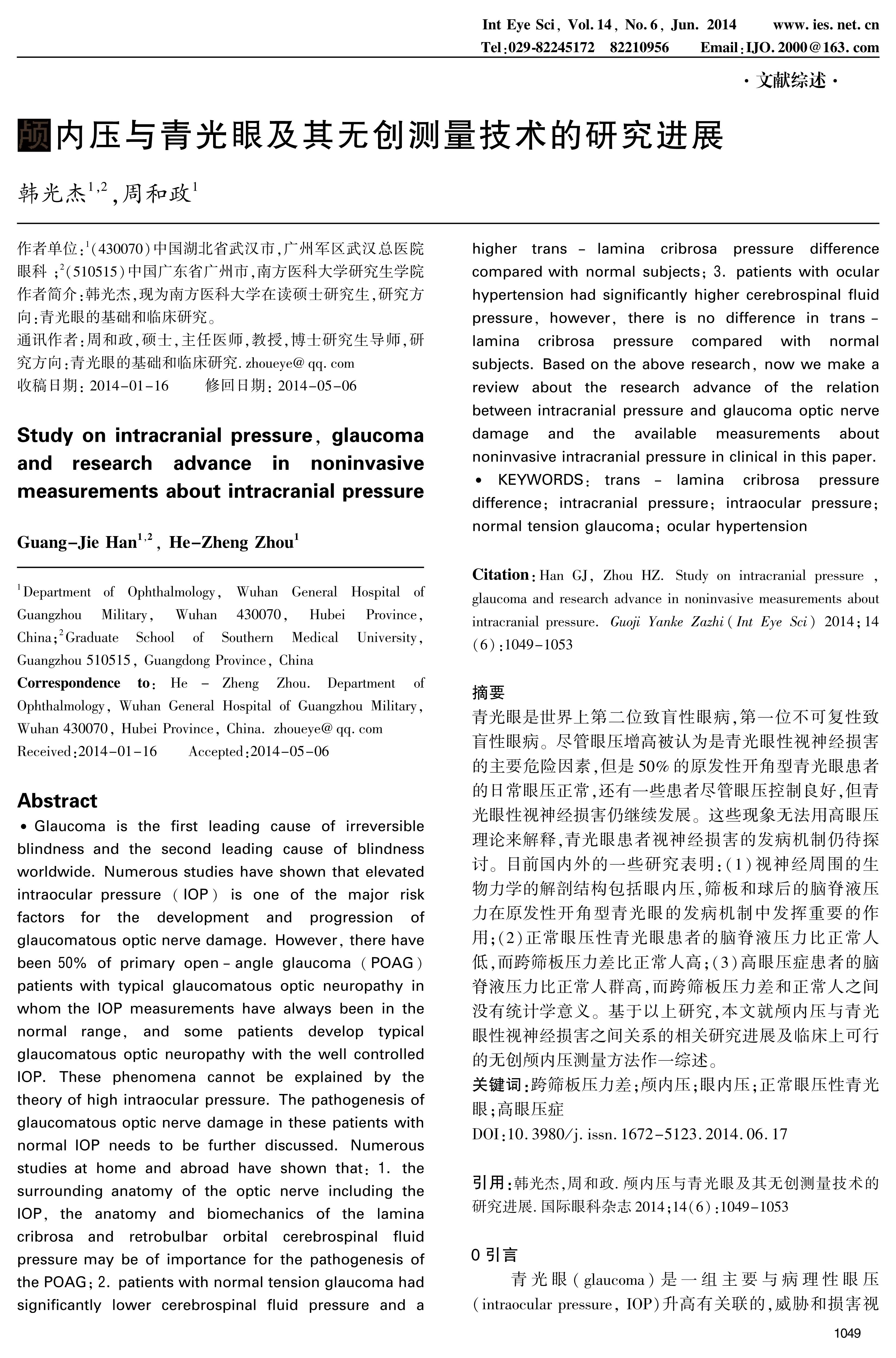 Glaucoma is the first leading cause of irreversible blindness and the second leading cause of blindness worldwide. Numerous studies have shown that elevated intraocular pressure(IOP)is one of the major risk factors for the development and progression of glaucomatous optic nerve damage. However, there have been 50% of primary open-angle glaucoma(POAG)patients with typical glaucomatous optic neuropathy in whom the IOP measurements have always been in the normal range, and some patients develop typical glaucomatous optic neuropathy with the well controlled IOP. These phenomena cannot be explained by the theory of high intraocular pressure. The pathogenesis of glaucomatous optic nerve damage in these patients with normal IOP needs to be further discussed. Numerous studies at home and abroad have shown that: 1. the surrounding anatomy of the optic nerve including the IOP, the anatomy and biomechanics of the lamina cribrosa and retrobulbar orbital cerebrospinal fluid pressure may be of importance for the pathogenesis of the POAG; 2. patients with normal tension glaucoma had significantly lower cerebrospinal fluid pressure and a higher trans-lamina cribrosa pressure difference compared with normal subjects; 3. patients with ocular hypertension had significantly higher cerebrospinal fluid pressure, however, there is no difference in trans-lamina cribrosa pressure compared with normal subjects. Based on the above research, now we make a review about the research advance of the relation between intracranial pressure and glaucoma optic nerve damage and the available measurements about noninvasive intracranial pressure in clinical in this paper.