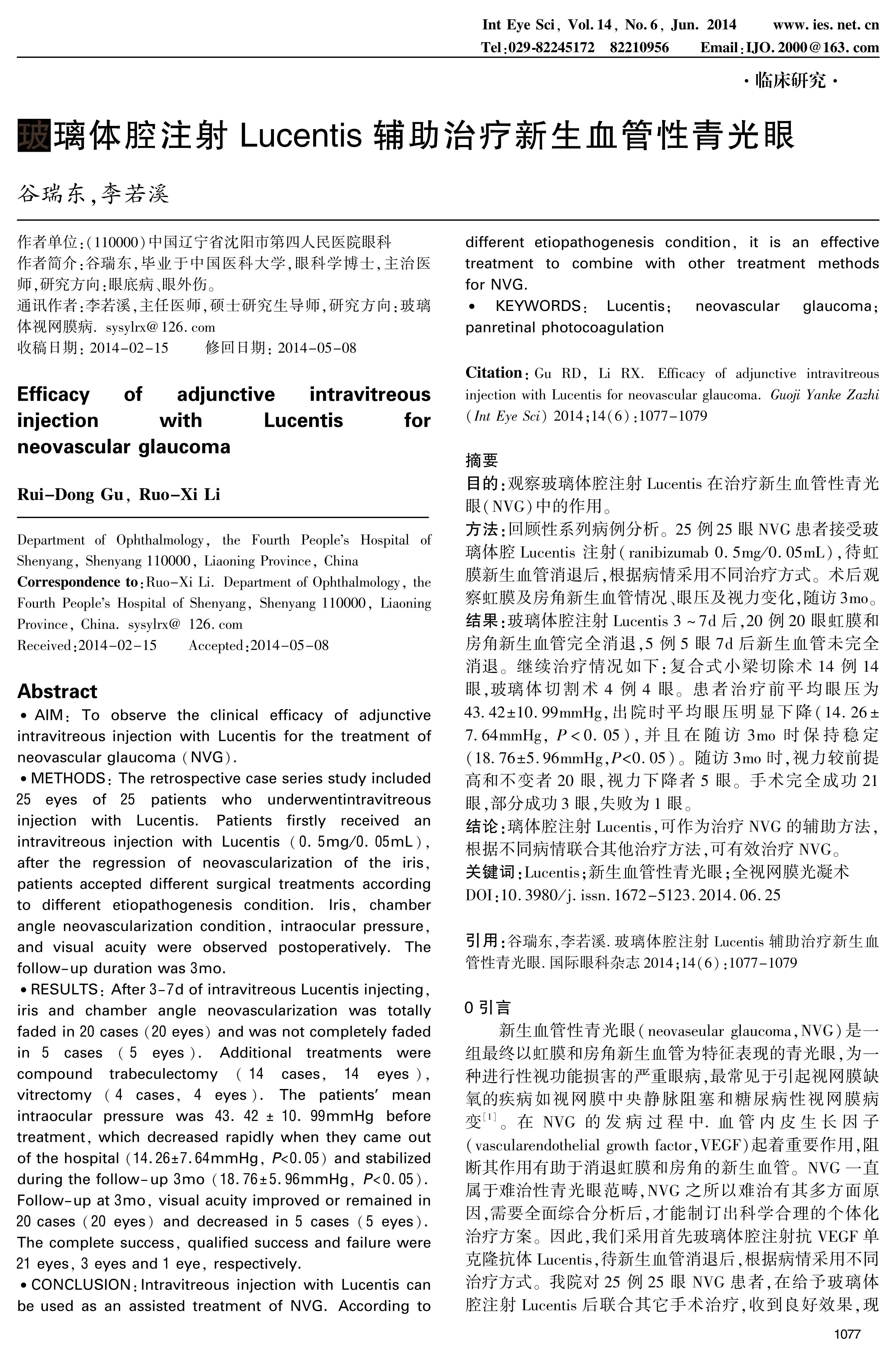 结论:璃体腔注射Lucentis,可作为治疗NVG的辅助方法,根据不同病情联合其他治疗方法,可有效治疗NVG。