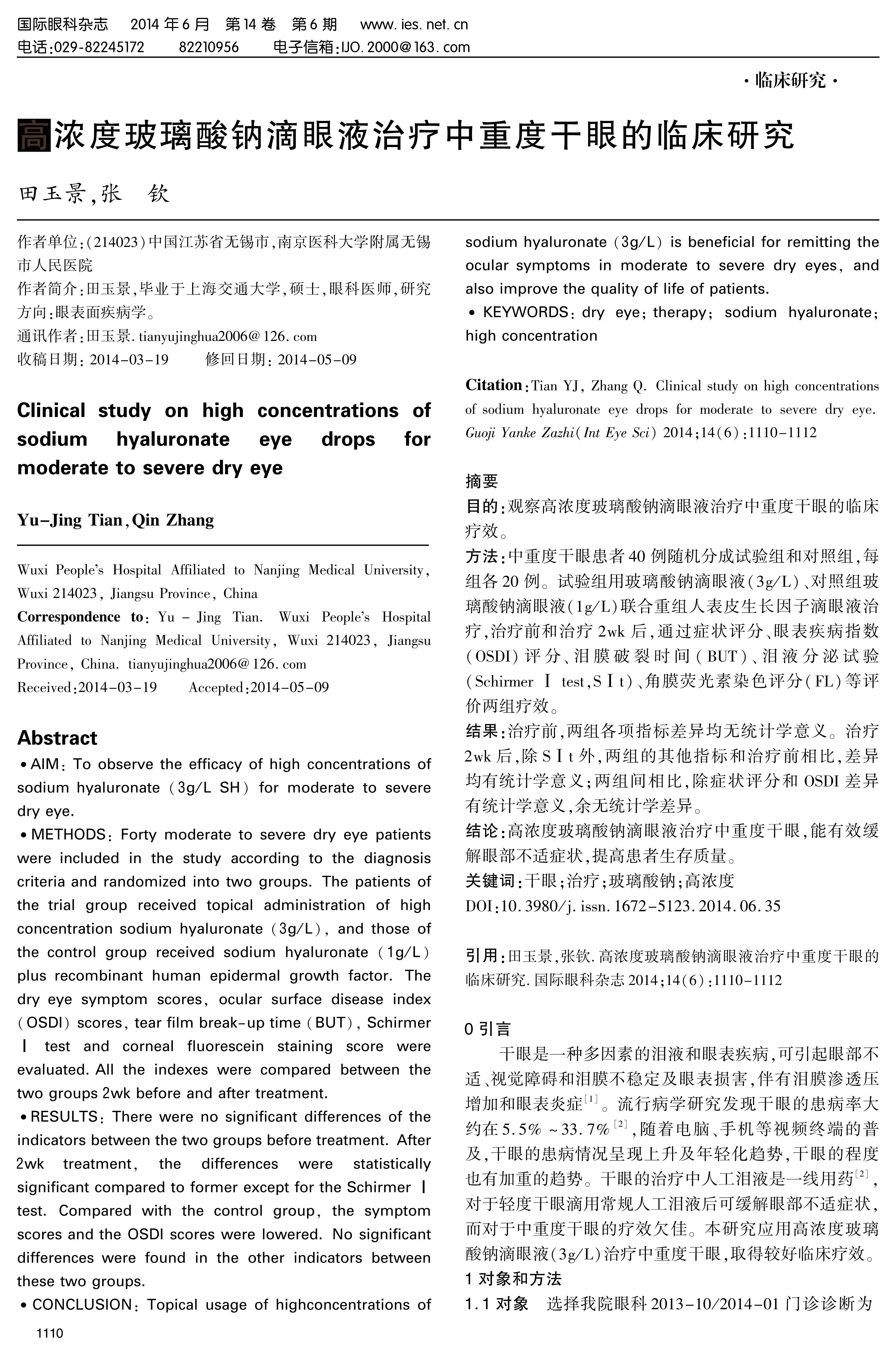 CONCLUSION: Topical usage of highconcentrations of sodium hyaluronate(3g/L)is beneficial for remitting the ocular symptoms in moderate to severe dry eyes, and also improve the quality of life of patients.