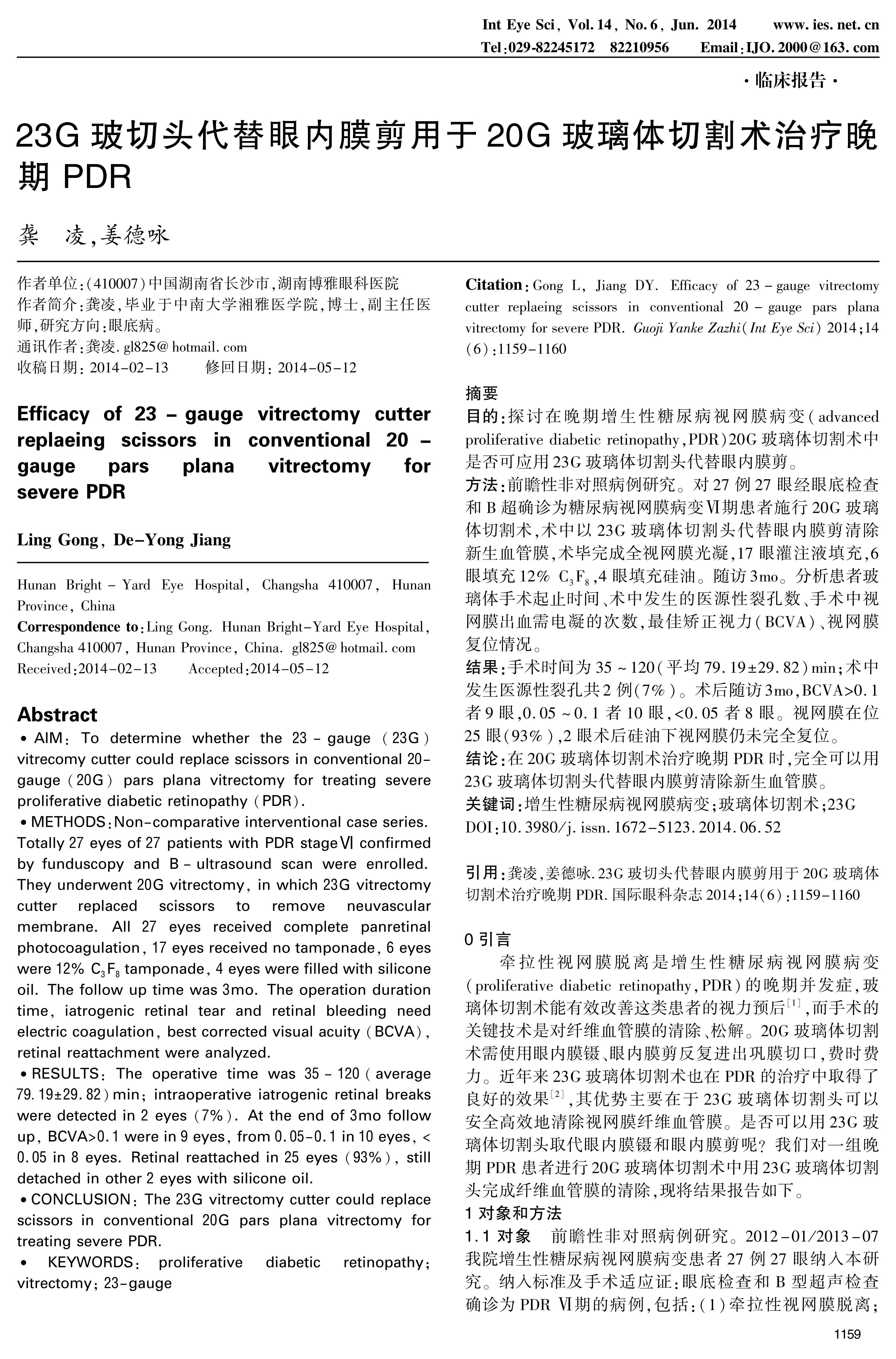 目的:探讨在晚期增生性糖尿病视网膜病变(advanced proliferative diabetic retinopathy,PDR)20G玻璃体切割术中是否可应用23G玻璃体切割头代替眼内膜剪。