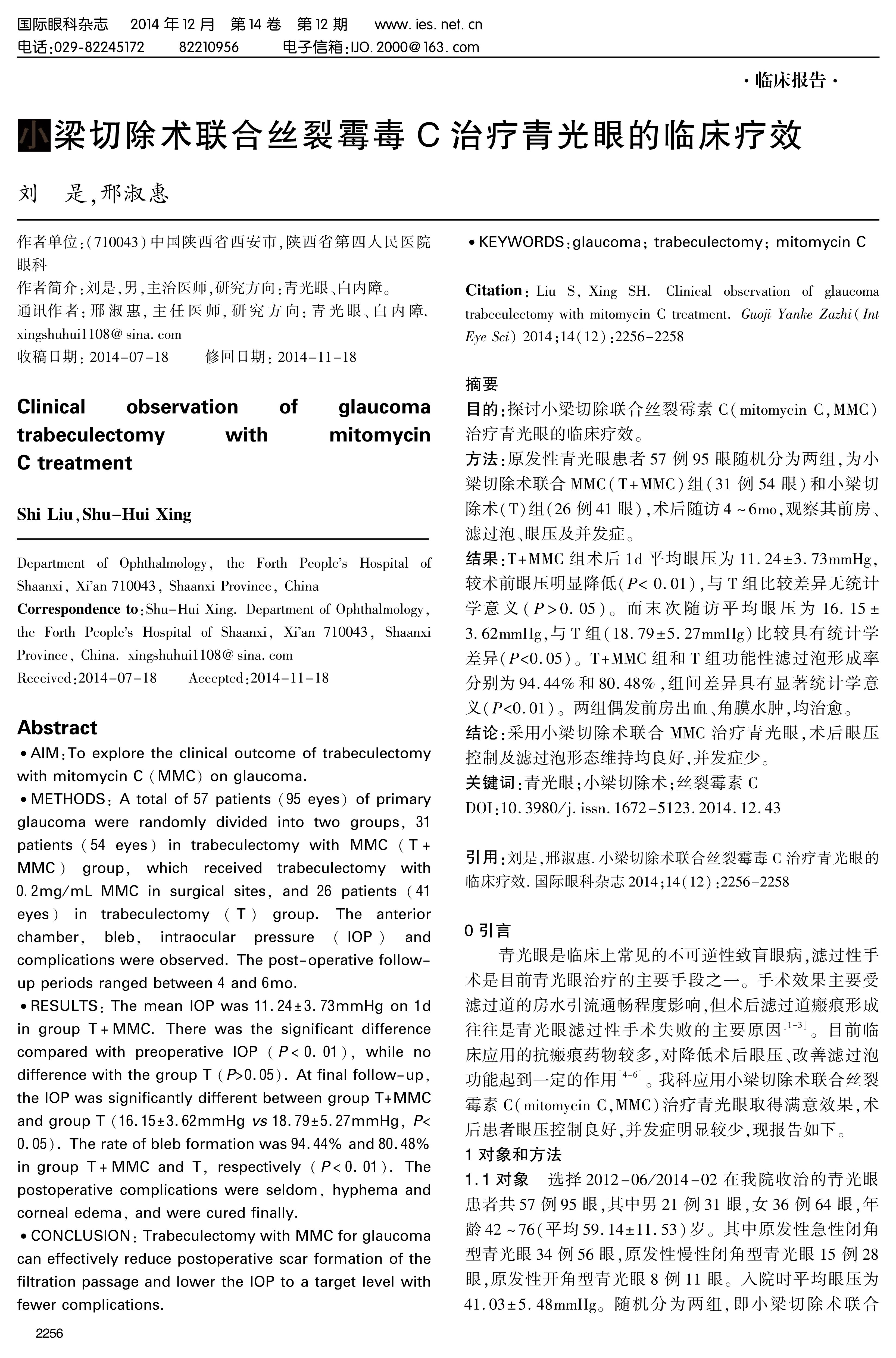 RESULTS: The mean IOP was 11.24±3.73mmHg on 1d in group T+MMC. There was the significant difference compared with preoperative IOP(P<0.01), while no difference with the group T(P>0.05). At final follow-up, the IOP was significantly different between group T+MMC and group T(16.15±3.62mmHg vs 18.79±5.27mmHg, P<0.05). The rate of bleb formation was 94.44% and 80.48% in group T+MMC and T, respectively(P<0.01). The postoperative complications were seldom, hyphema and corneal edema, and were cured finally.