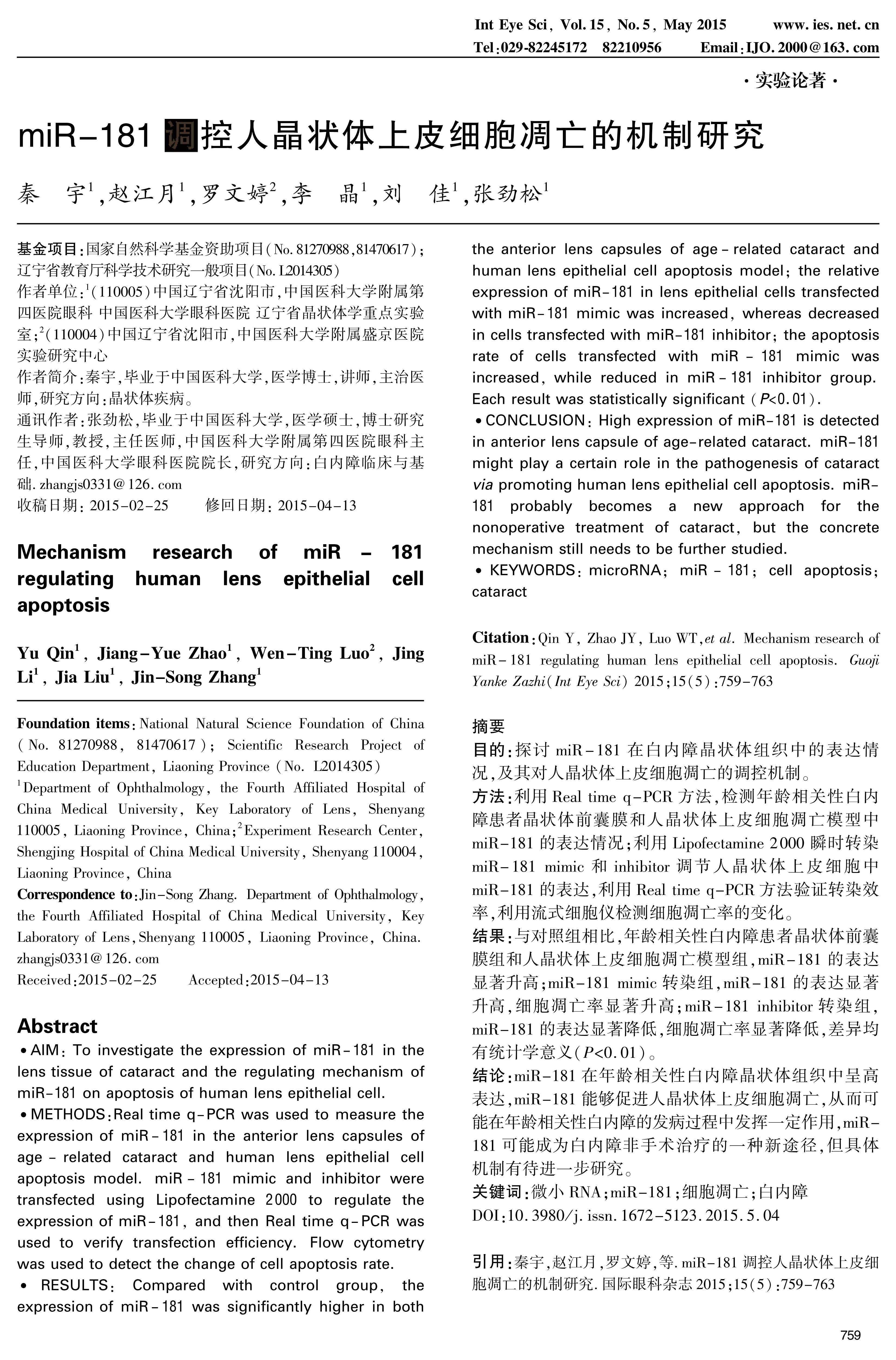 CONCLUSION: High expression of miR-181 is detected in anterior lens capsule of age-related cataract. miR-181 might play a certain role in the pathogenesis of cataract via promoting human lens epithelial cell apoptosis. miR-181 probably becomes a new approach for the nonoperative treatment of cataract, but the concrete mechanism still needs to be further studied.