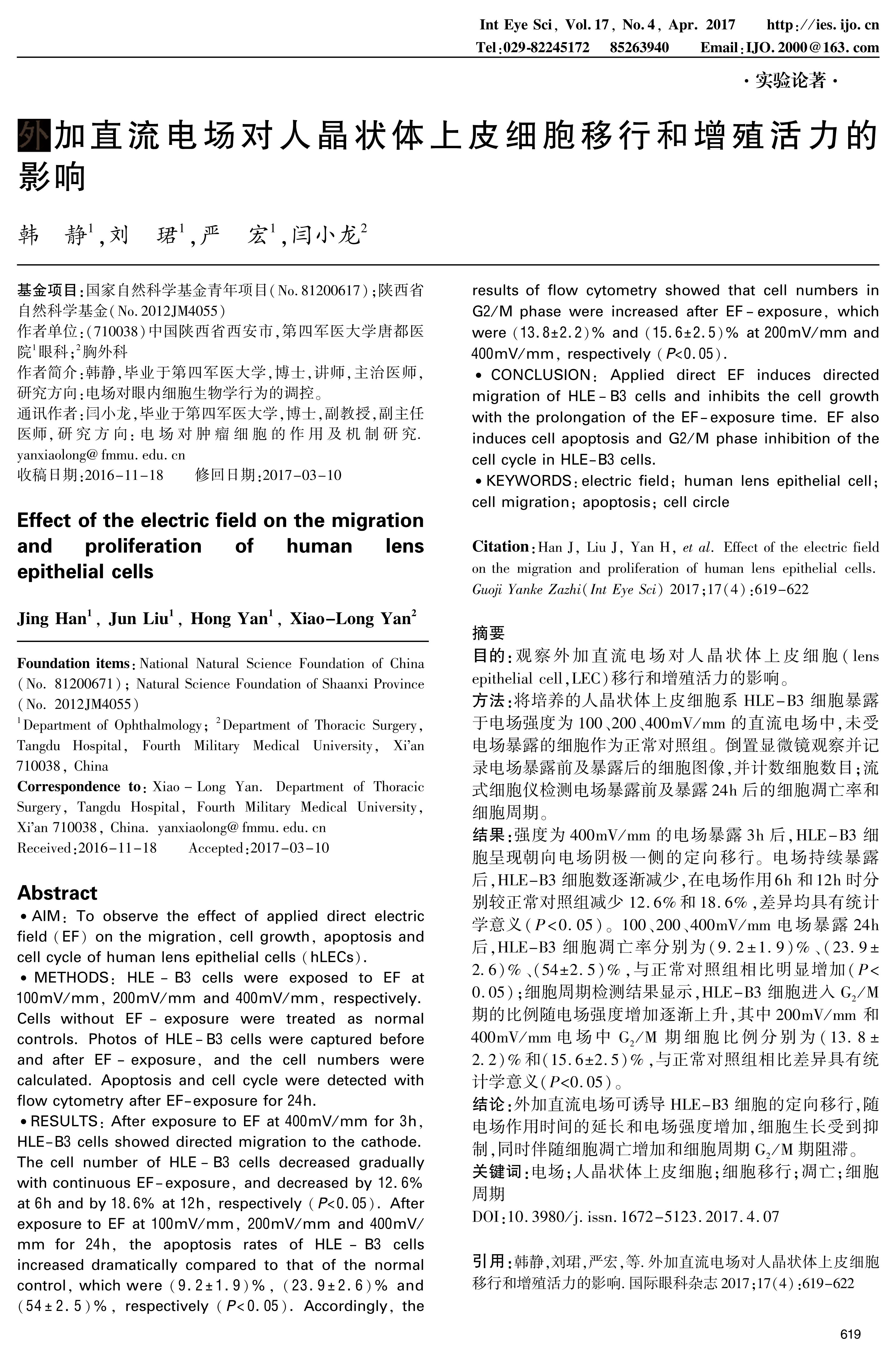 RESULTS: After exposure to EF at 400mV/mm for 3h, HLE-B3 cells showed directed migration to the cathode. The cell number of HLE-B3 cells decreased gradually with continuous EF-exposure, and decreased by 12.6% at 6h and by 18.6% at 12h, respectively(P<0.05). After exposure to EF at 100mV/mm, 200mV/mm and 400mV/mm for 24h, the apoptosis rates of HLE-B3 cells increased dramatically compared to that of the normal control, which were(9.2±1.9)%,(23.9±2.6)% and(54±2.5)%, respectively(P<0.05). Accordingly, the results of flow cytometry showed that cell numbers in G2/M phase were increased after EF-exposure, which were(13.8±2.2)% and(15.6±2.5)% at 200mV/mm and 400mV/mm, respectively(P<0.05).