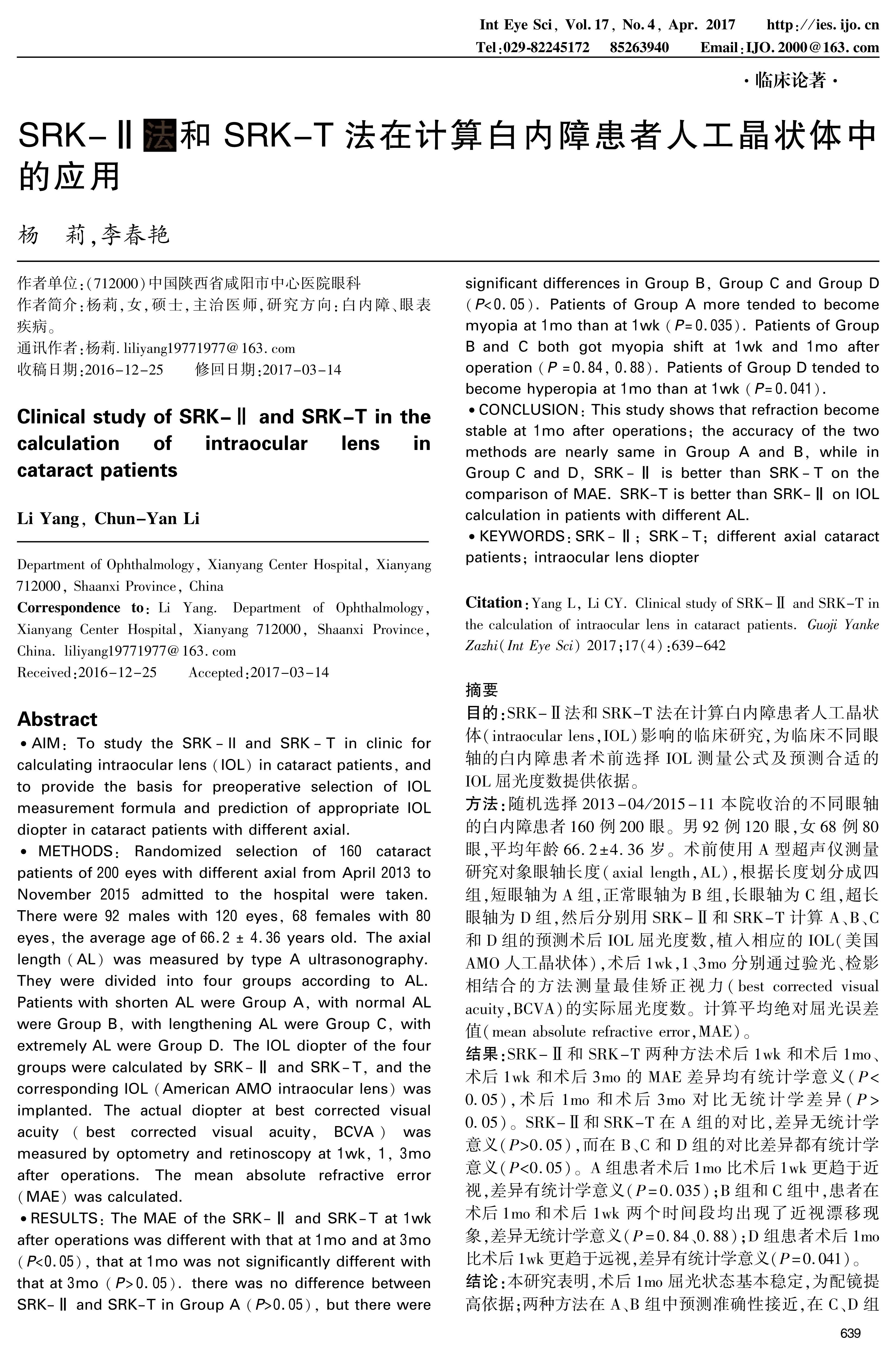 CONCLUSION: This study shows that refraction become stable at 1mo after operations; the accuracy of the two methods are nearly same in Group A and B, while in Group C and D, SRK-Ⅱ is better than SRK-T on the comparison of MAE. SRK-T is better than SRK-Ⅱ on IOL calculation in patients with different AL.