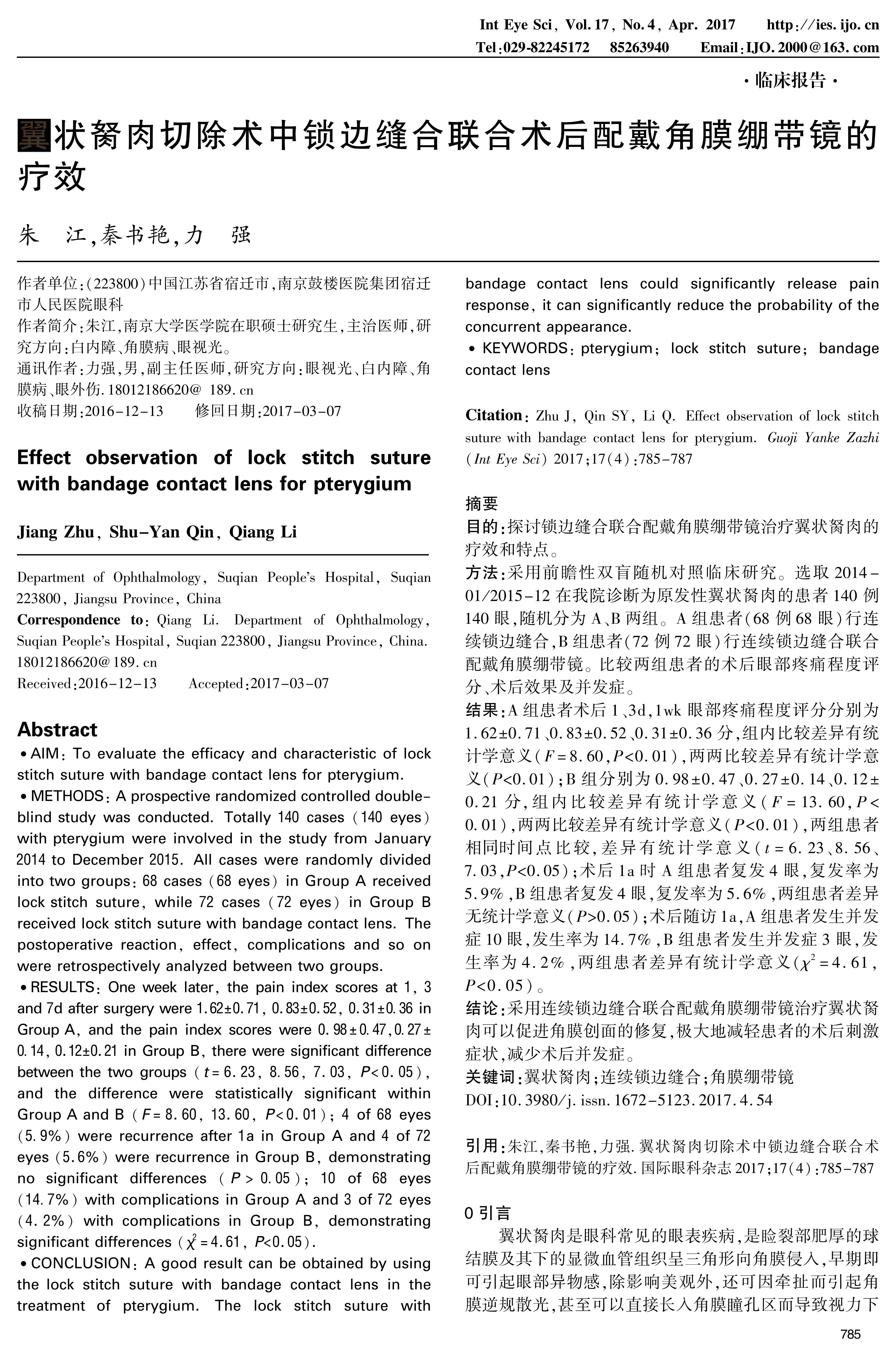 CONCLUSION: A good result can be obtained by using the lock stitch suture with bandage contact lens in the treatment of pterygium. The lock stitch suture with bandage contact lens could significantly release pain response, it can significantly reduce the probability of the concurrent appearance.