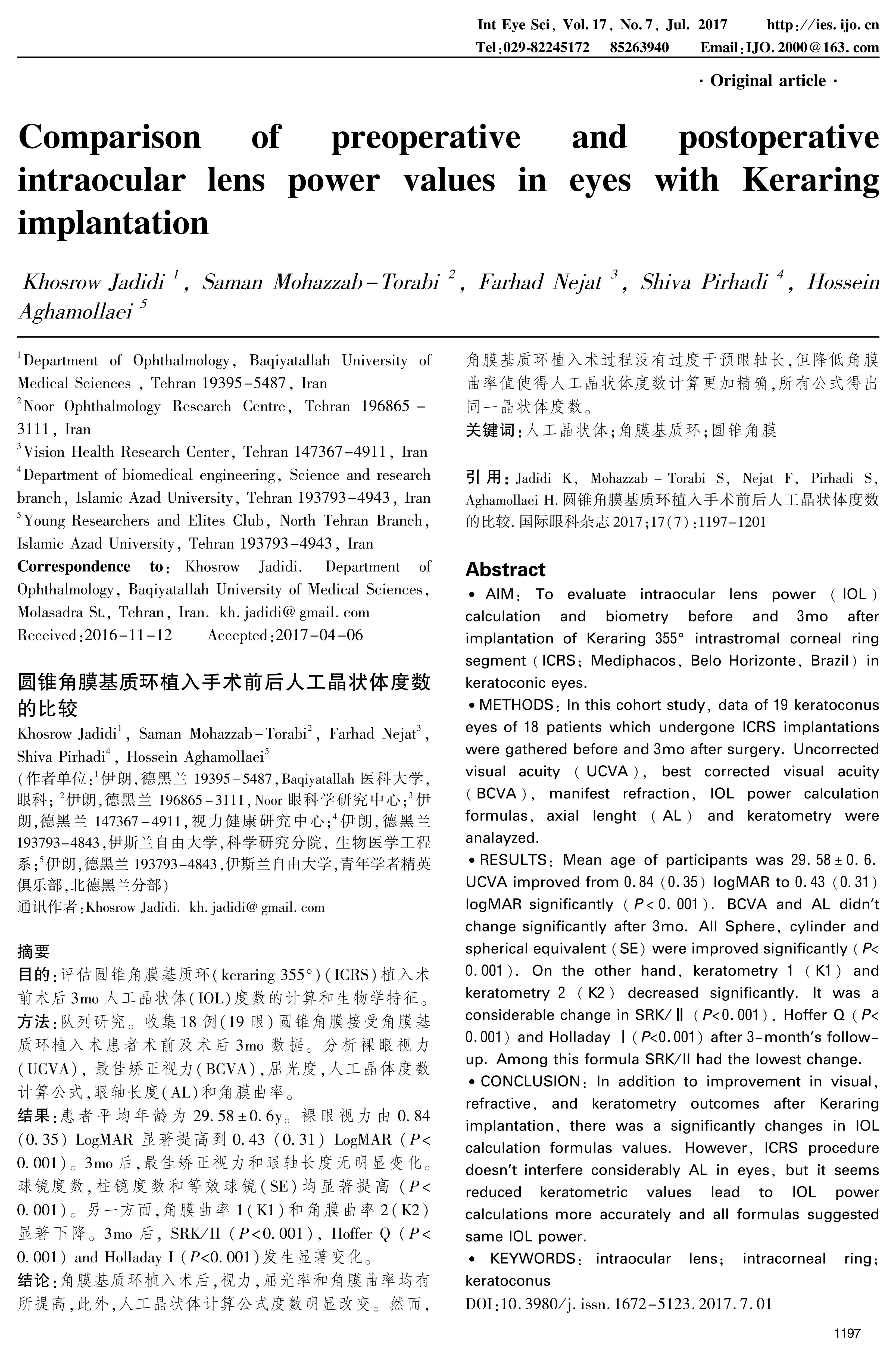 目的:评估圆锥角膜基质环(keraring 355°)(ICRS)植入术前术后3mo人工晶状体(IOL)度数的计算和生物学特征。