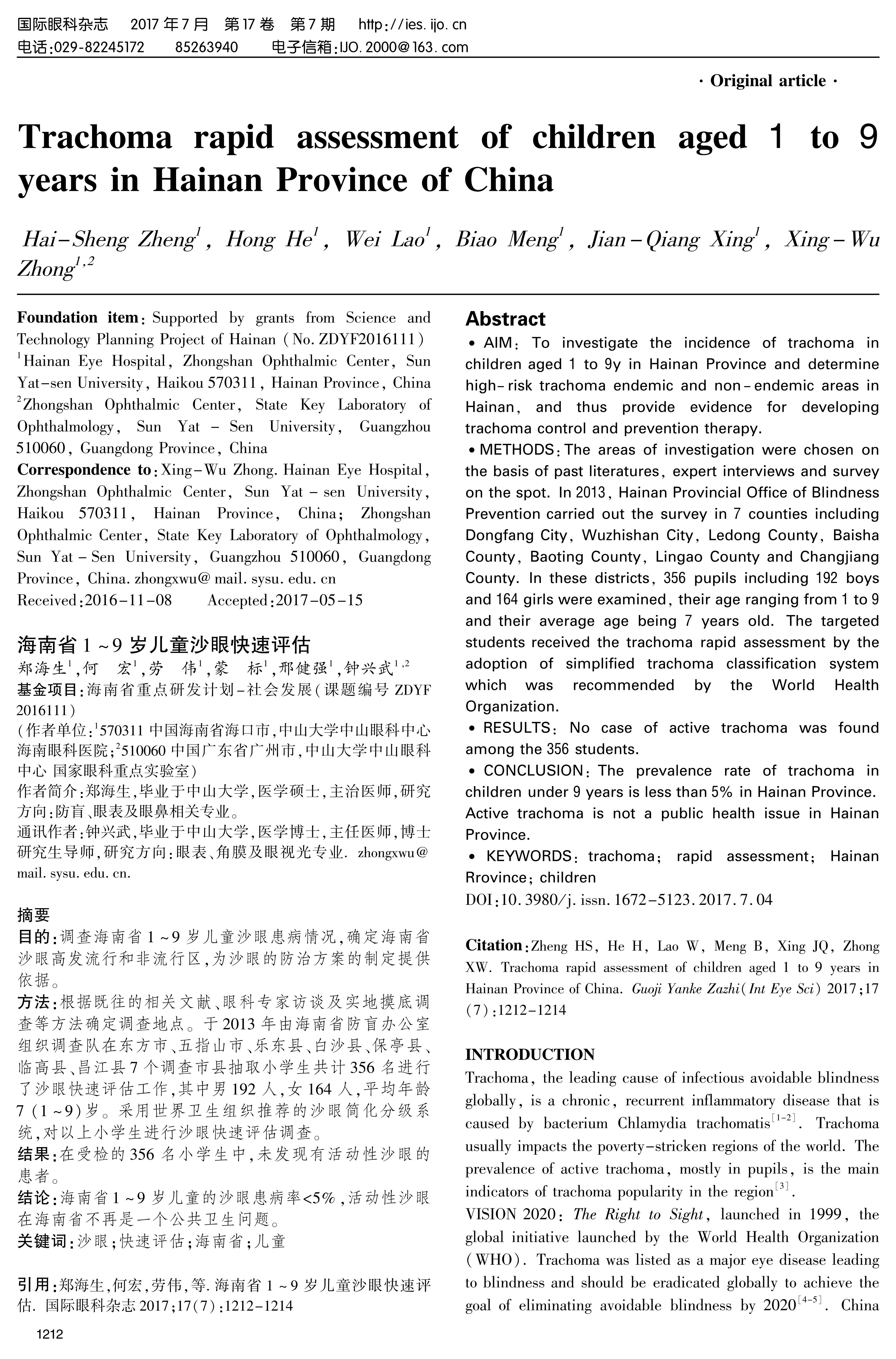 结论:海南省1~9岁儿童的沙眼患病率<5%,活动性沙眼在海南省不再是一个公共卫生问题。