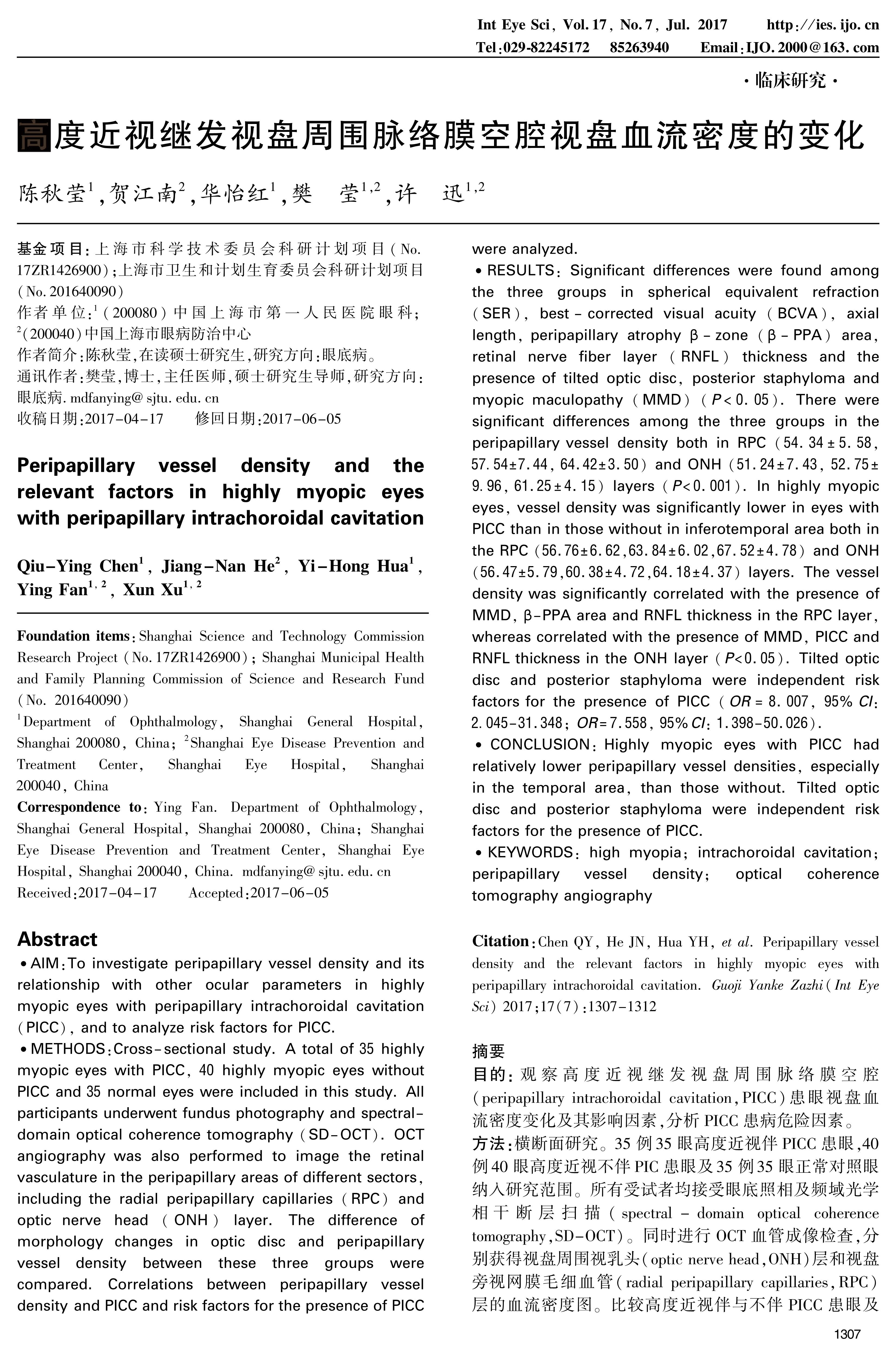 RESULTS: Significant differences were found among the three groups in spherical equivalent refraction(SER), best-corrected visual acuity(BCVA), axial length, peripapillary atrophy β-zone(β-PPA)area, retinal nerve fiber layer(RNFL)thickness and the presence of tilted optic disc, posterior staphyloma and myopic maculopathy(MMD)(P<0.05). There were significant differences among the three groups in the peripapillary vessel density both in RPC(54.34±5.58, 57.54±7.44, 64.42±3.50)and ONH(51.24±7.43, 52.75±9.96, 61.25±4.15)layers(P<0.001). In highly myopic eyes, vessel density was significantly lower in eyes with PICC than in those without in inferotemporal area both in the RPC(56.76±6.62,63.84±6.02,67.52±4.78)and ONH(56.47±5.79,60.38±4.72,64.18±4.37)layers. The vessel density was significantly correlated with the presence of MMD, β-PPA area and RNFL thickness in the RPC layer, whereas correlated with the presence of MMD, PICC and RNFL thickness in the ONH layer(P<0.05). Tilted optic disc and posterior staphyloma were independent risk factors for the presence of PICC(OR=8.007, 95%CI: 2.045-31.348; OR=7.558, 95%CI: 1.398-50.026).
