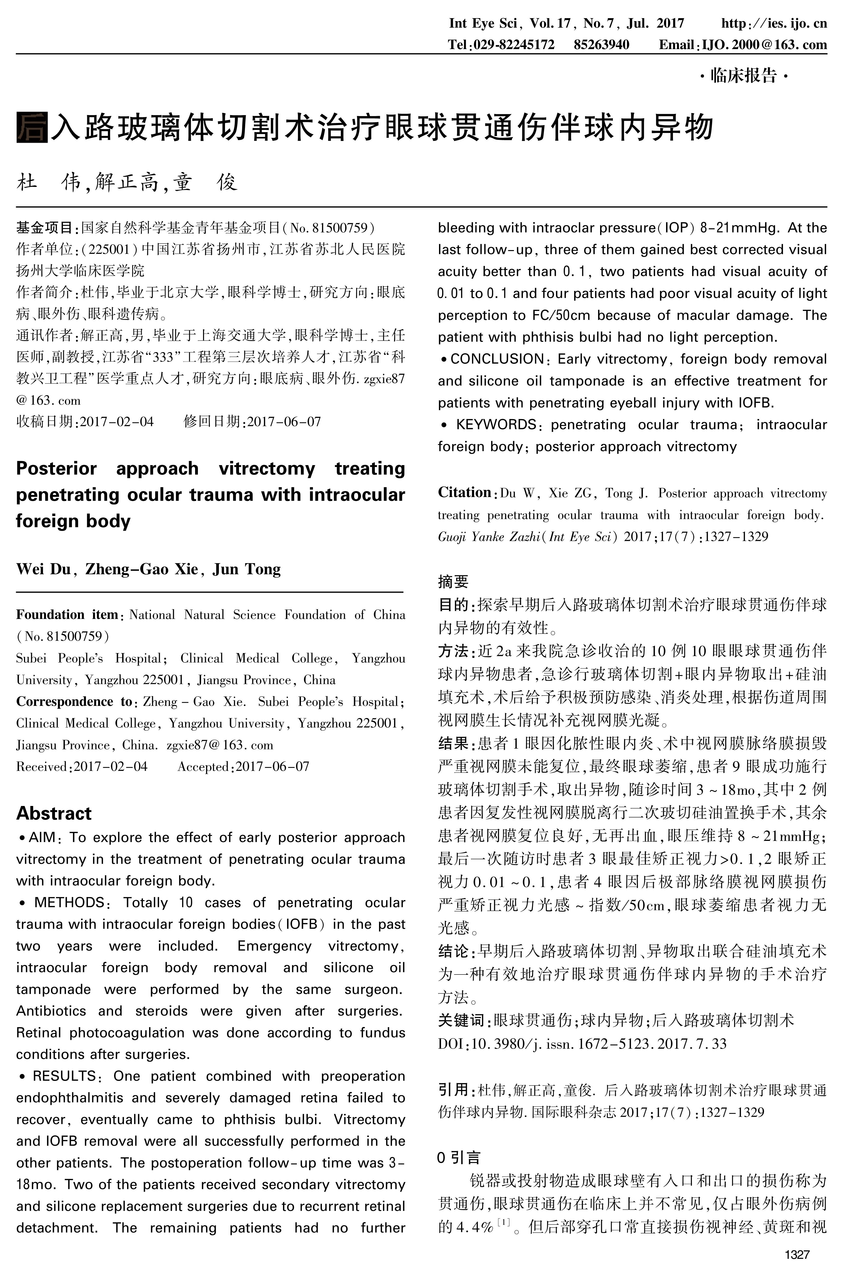 结论:早期后入路玻璃体切割、异物取出联合硅油填充术为一种有效地治疗眼球贯通伤伴球内异物的手术治疗方法。