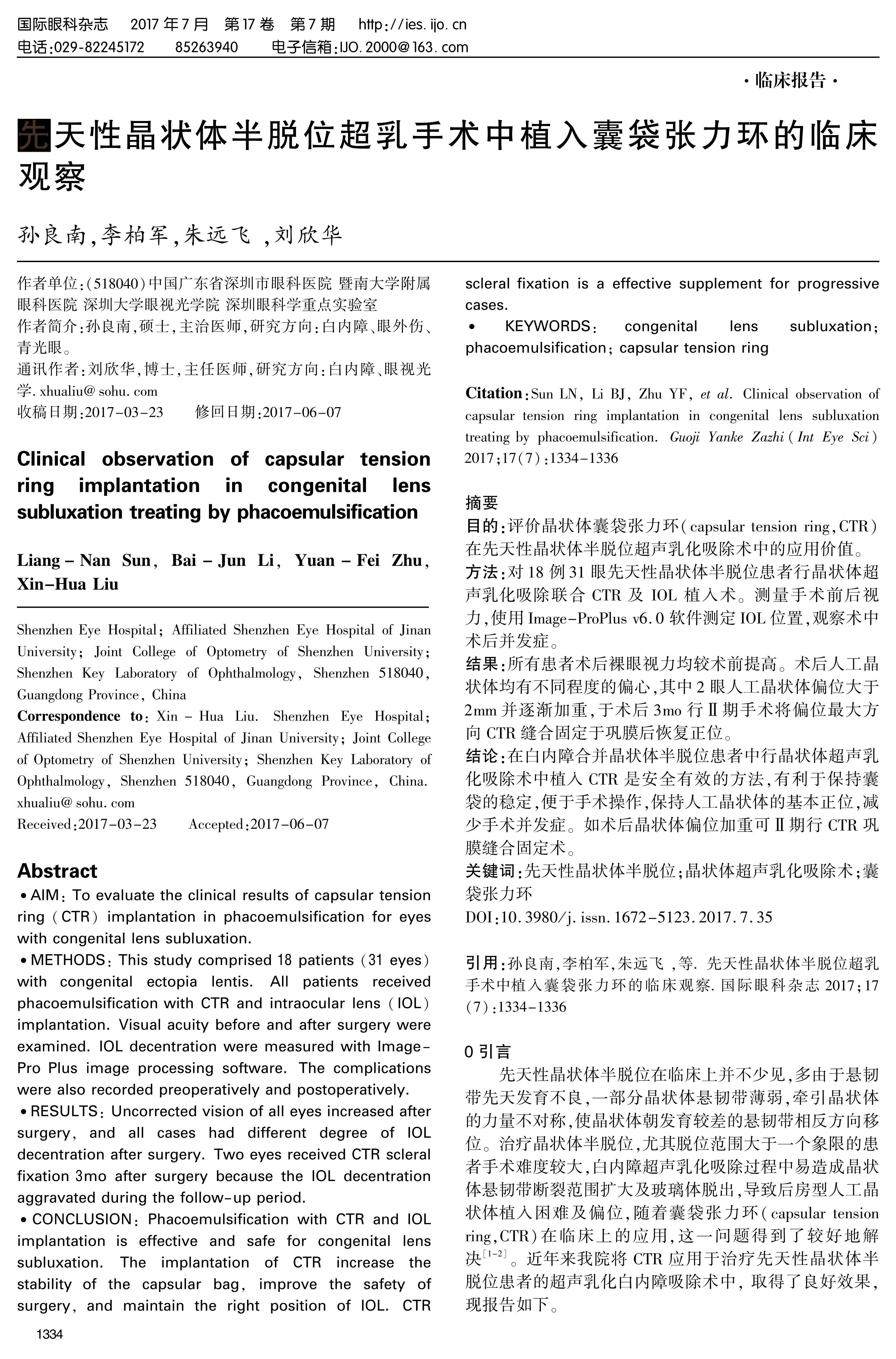 结论:在白内障合并晶状体半脱位患者中行晶状体超声乳化吸除术中植入CTR是安全有效的方法,有利于保持囊袋的稳定,便于手术操作,保持人工晶状体的基本正位,减少手术并发症。如术后晶状体偏位加重可Ⅱ期行CTR巩膜缝合固定术。
