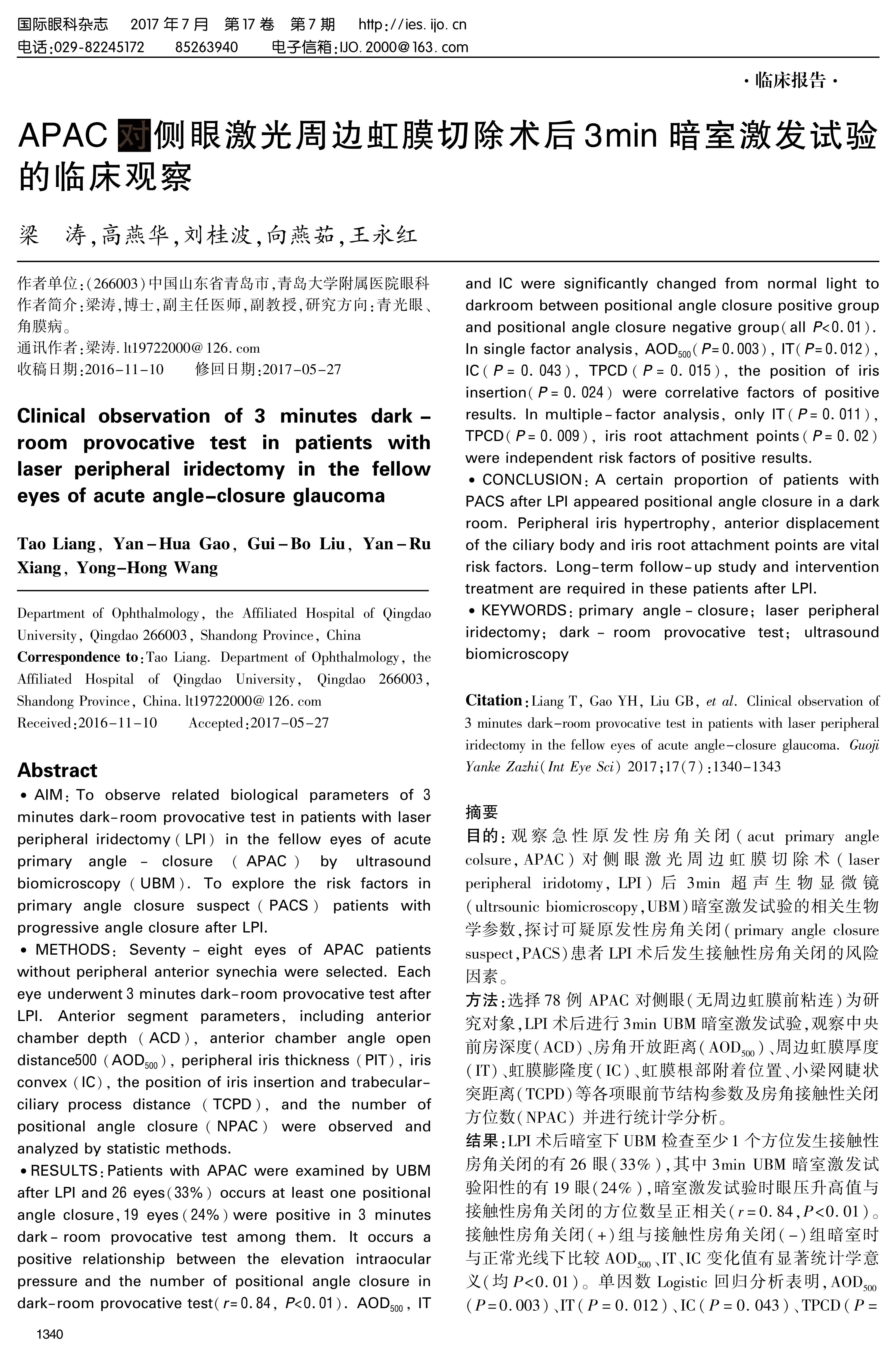 AIM:To observe related biological parameters of 3 minutes dark-room provocative test in patients with laser peripheral iridectomy(LPI)in the fellow eyes of acute primary angle-closure(APAC)by ultrasound biomicroscopy(UBM). To explore the risk factors in primary angle closure suspect(PACS)patients with progressive angle closure after LPI.