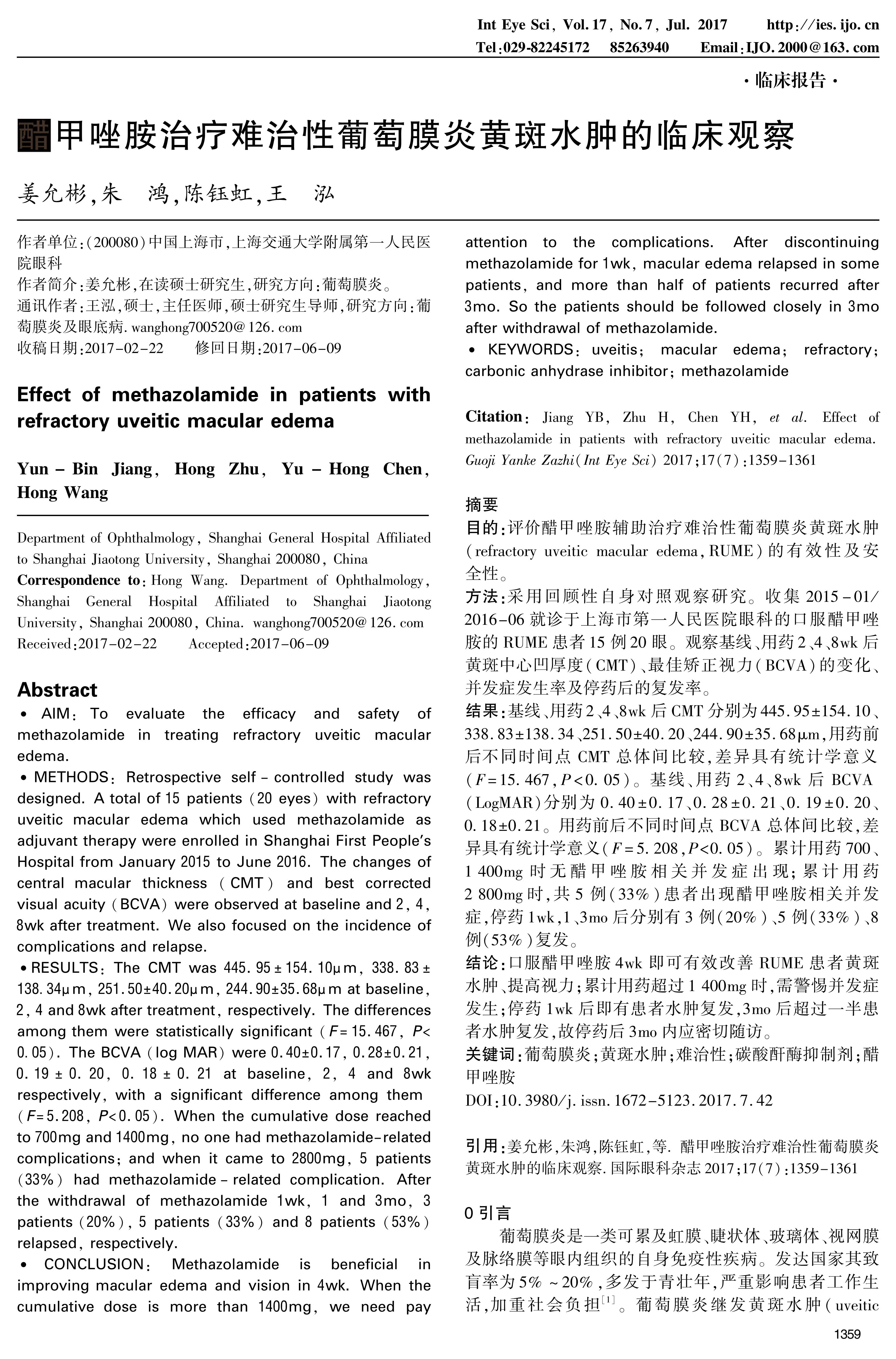 方法:采用回顾性自身对照观察研究。收集2015-01/2016-06就诊于上海市第一人民医院眼科的口服醋甲唑胺的RUME患者15例20眼。观察基线、用药2、4、8wk后黄斑中心凹厚度(CMT)、最佳矫正视力(BCVA)的变化、并发症发生率及停药后的复发率。