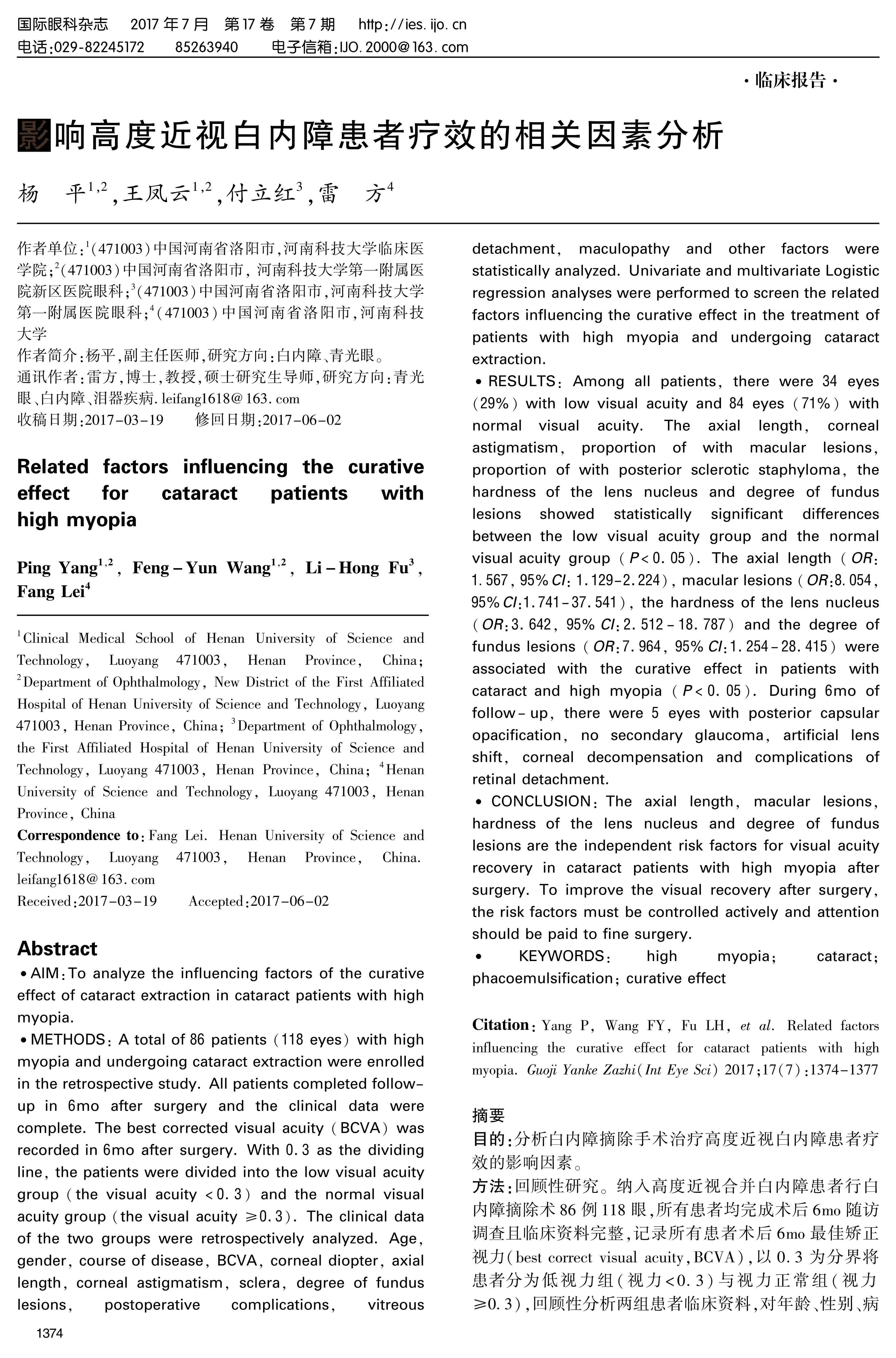 目的:分析白内障摘除手术治疗高度近视白内障患者疗效的影响因素。