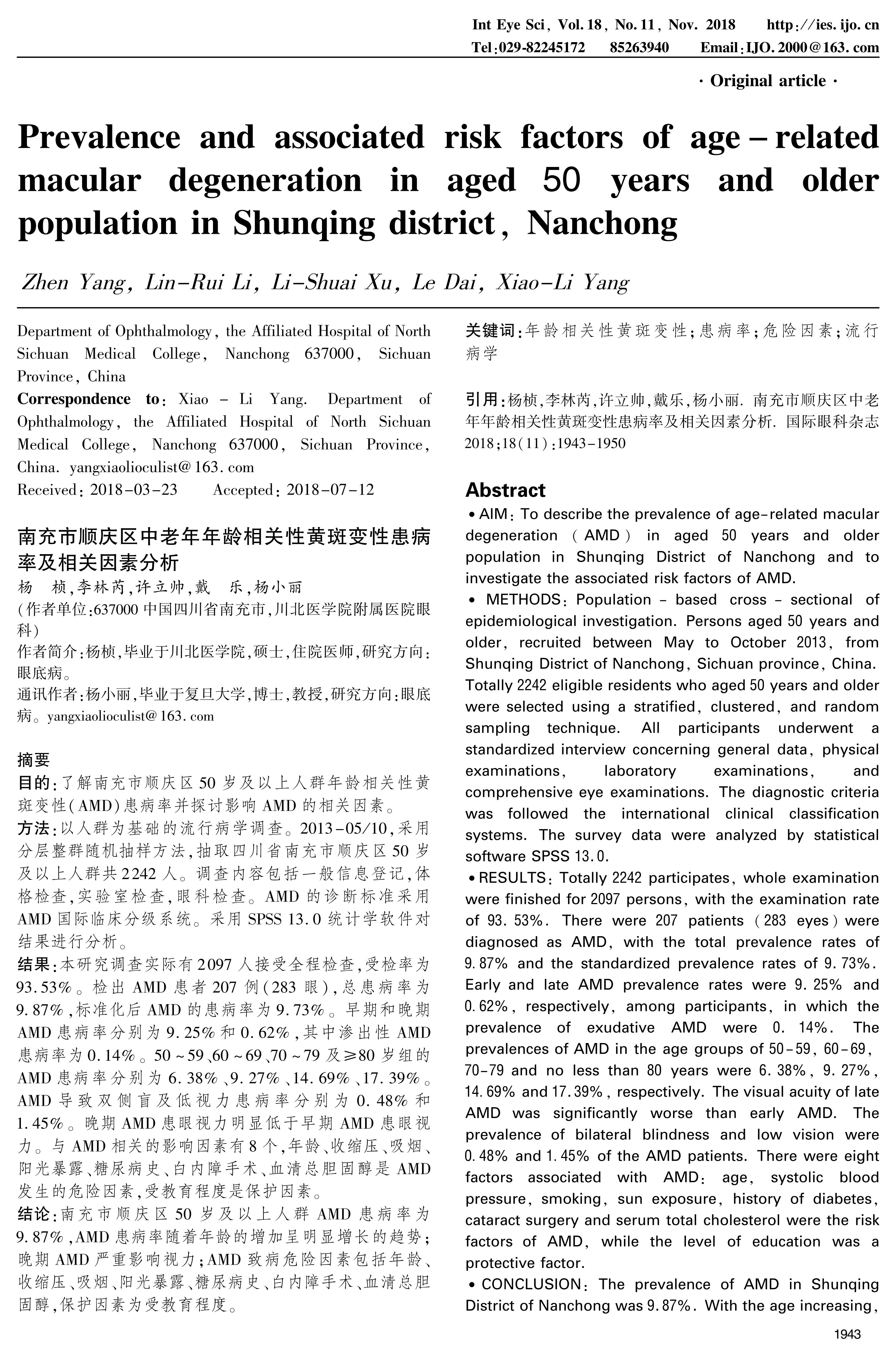 AIM: To describe the prevalence of age-related macular degeneration(AMD)in aged 50 years and older population in Shunqing District of Nanchong and to investigate the associated risk factors of AMD.