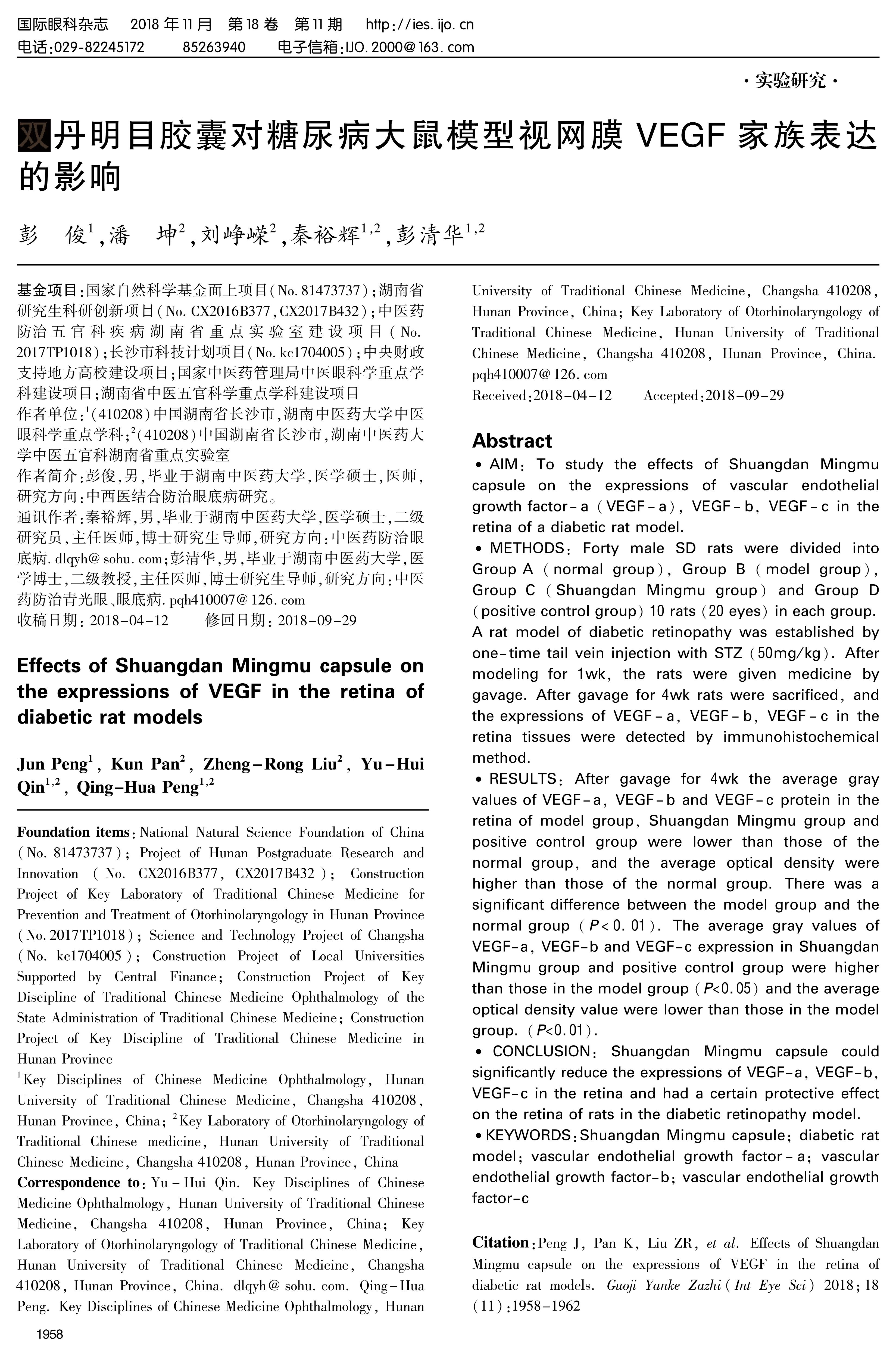 METHODS: Forty male SD rats were divided into Group A(normal group), Group B(model group), Group C(Shuangdan Mingmu group)and Group D(positive control group)10 rats(20 eyes)in each group. A rat model of diabetic retinopathy was established by one-time tail vein injection with STZ(50mg/kg). After modeling for 1wk, the rats were given medicine by gavage. After gavage for 4wk rats were sacrificed, and the expressions of VEGF-a, VEGF-b, VEGF-c in the retina tissues were detected by immunohistochemical method.