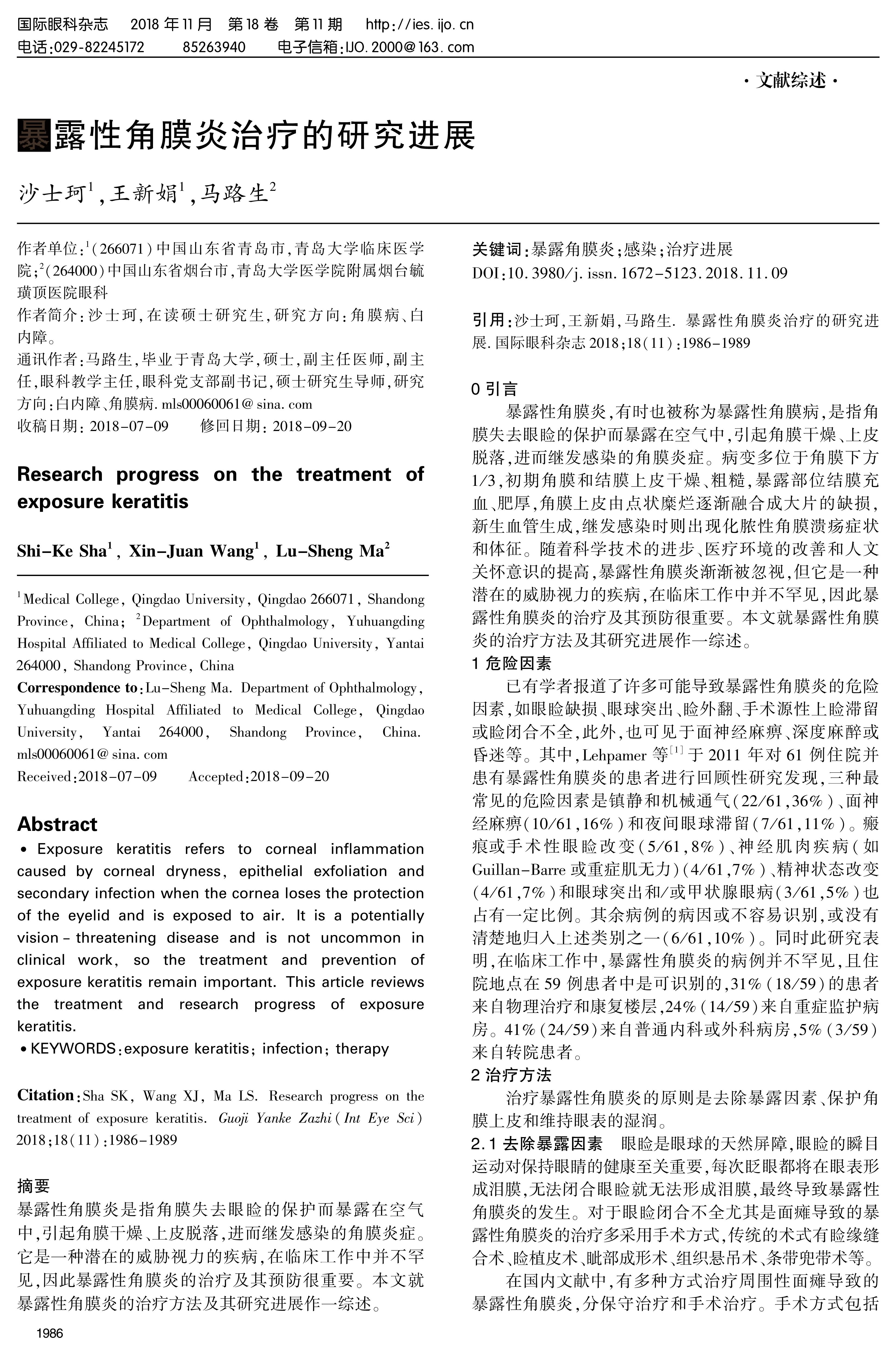 Exposure keratitis refers to corneal inflammation caused by corneal dryness, epithelial exfoliation and secondary infection when the cornea loses the protection of the eyelid and is exposed to air. It is a potentially vision-threatening disease and is not uncommon in clinical work, so the treatment and prevention of exposure keratitis remain important. This article reviews the treatment and research progress of exposure keratitis.