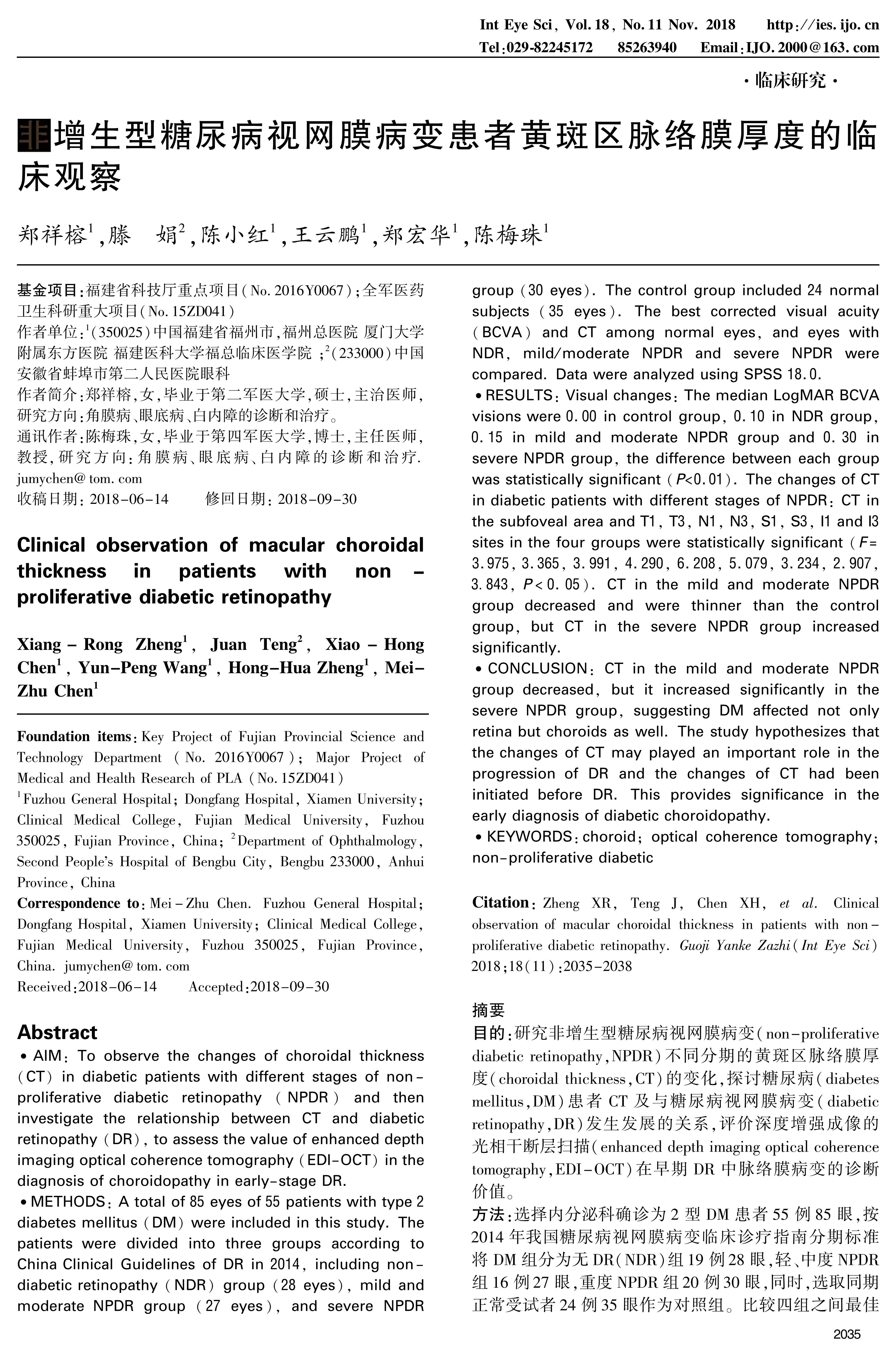 METHODS: A total of 85 eyes of 55 patients with type 2 diabetes mellitus(DM)were included in this study. The patients were divided into three groups according to China Clinical Guidelines of DR in 2014, including non-diabetic retinopathy(NDR)group(28 eyes), mild and moderate NPDR group(27 eyes), and severe NPDR group(30 eyes). The control group included 24 normal subjects(35 eyes). The best corrected visual acuity(BCVA)and CT among normal eyes, and eyes with NDR, mild/moderate NPDR and severe NPDR were compared. Data were analyzed using SPSS 18.0.