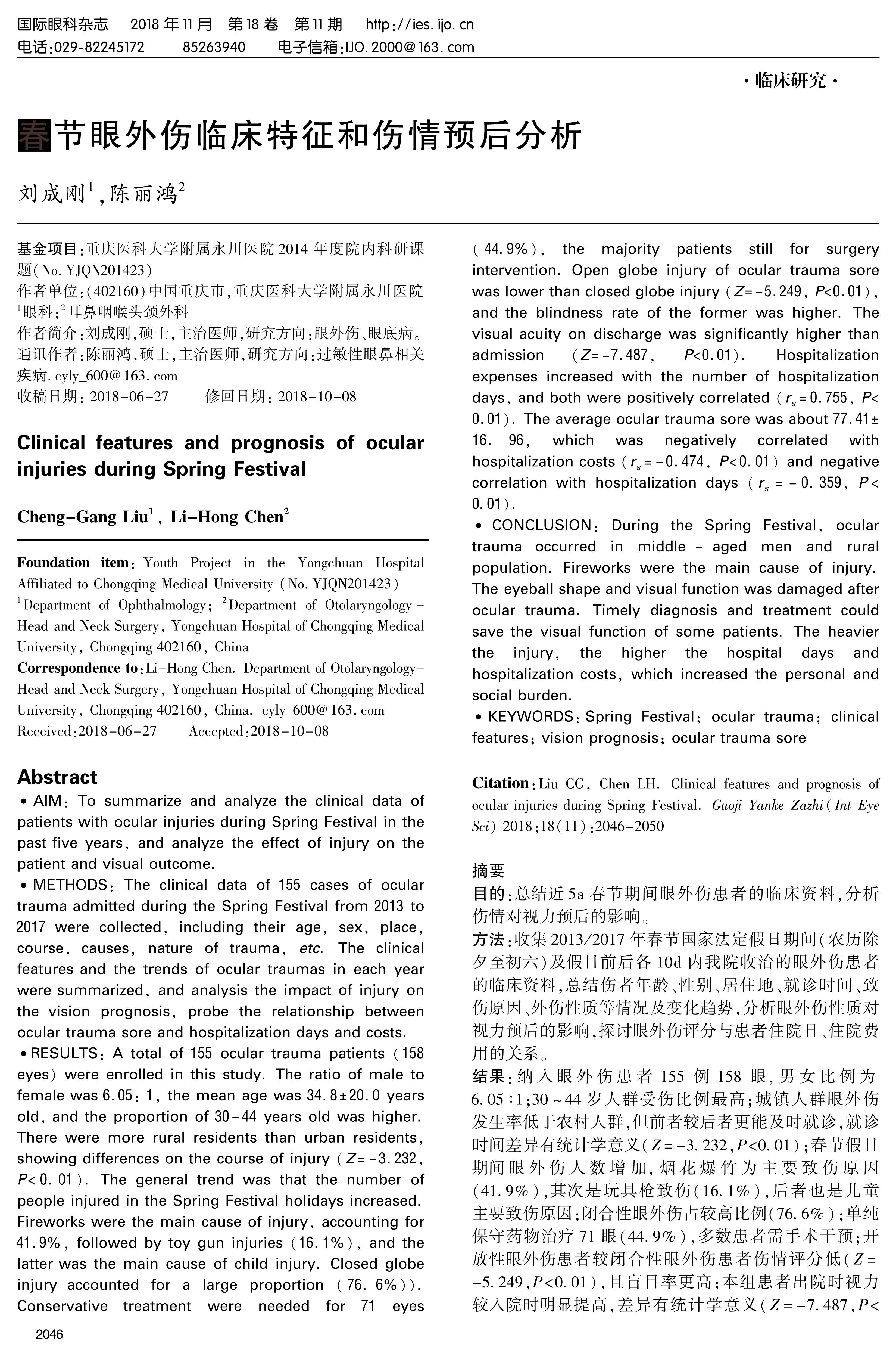 RESULTS: A total of 155 ocular trauma patients(158 eyes)were enrolled in this study. The ratio of male to female was 6.05: 1, the mean age was 34.8±20.0 years old, and the proportion of 30-44 years old was higher. There were more rural residents than urban residents, showing differences on the course of injury(Z=-3.232, P<0.01). The general trend was that the number of people injured in the Spring Festival holidays increased. Fireworks were the main cause of injury, accounting for 41.9%, followed by toy gun injuries(16.1%), and the latter was the main cause of child injury. Closed globe injury accounted for a large proportion(76.6%)). Conservative treatment were needed for 71 eyes(44.9%), the majority patients still for surgery intervention. Open globe injury of ocular trauma sore was lower than closed globe injury(Z=-5.249, P<0.01), and the blindness rate of the former was higher. The visual acuity on discharge was significantly higher than admission(Z=-7.487, P<0.01). Hospitalization expenses increased with the number of hospitalization days, and both were positively correlated(rs=0.755, P<0.01). The average ocular trauma sore was about 77.41±16.96, which was negatively correlated with hospitalization costs(rs=-0.474, P<0.01)and negative correlation with hospitalization days(rs=-0.359, P<0.01).