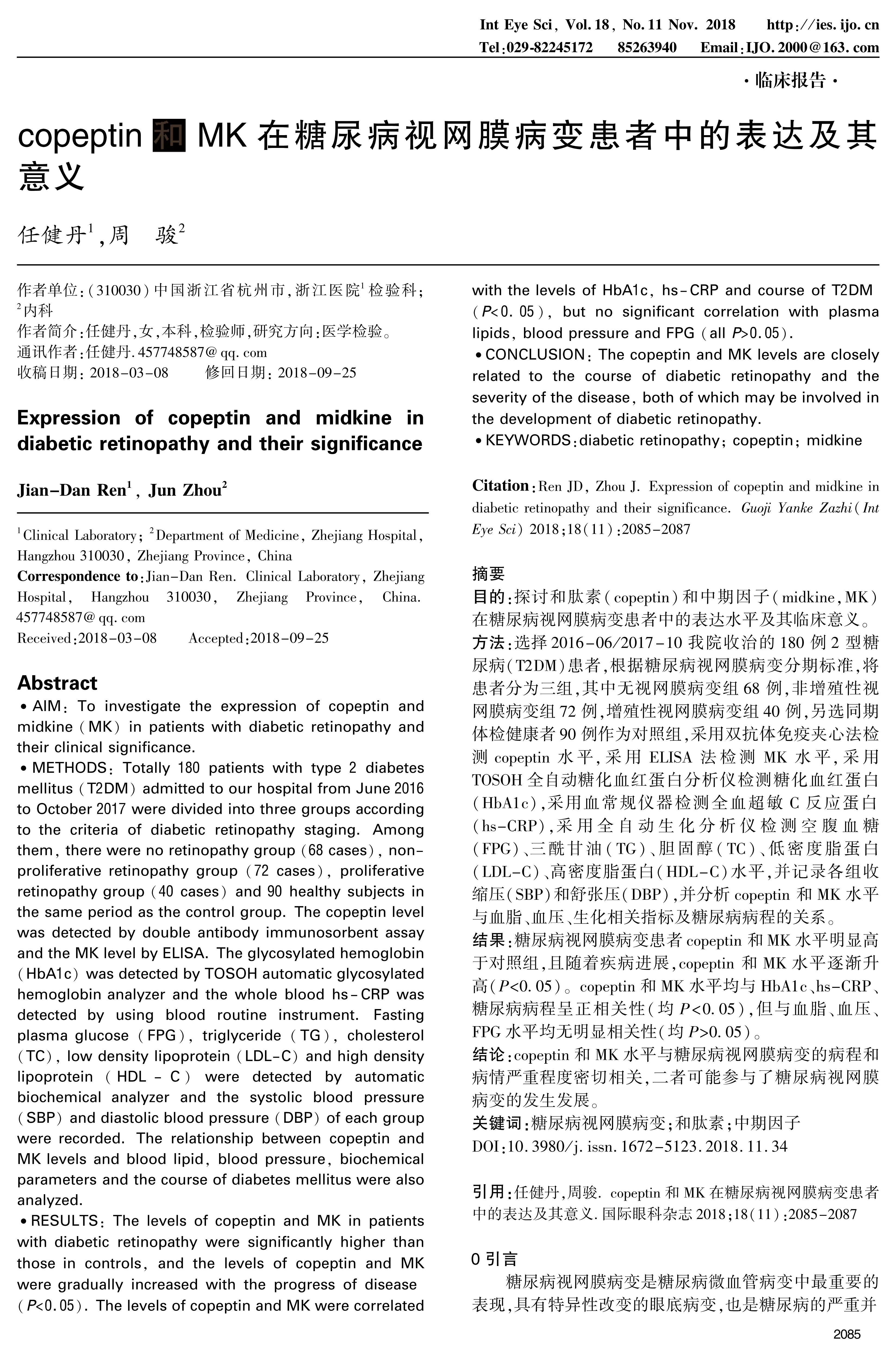 CONCLUSION: The copeptin and MK levels are closely related to the course of diabetic retinopathy and the severity of the disease, both of which may be involved in the development of diabetic retinopathy.