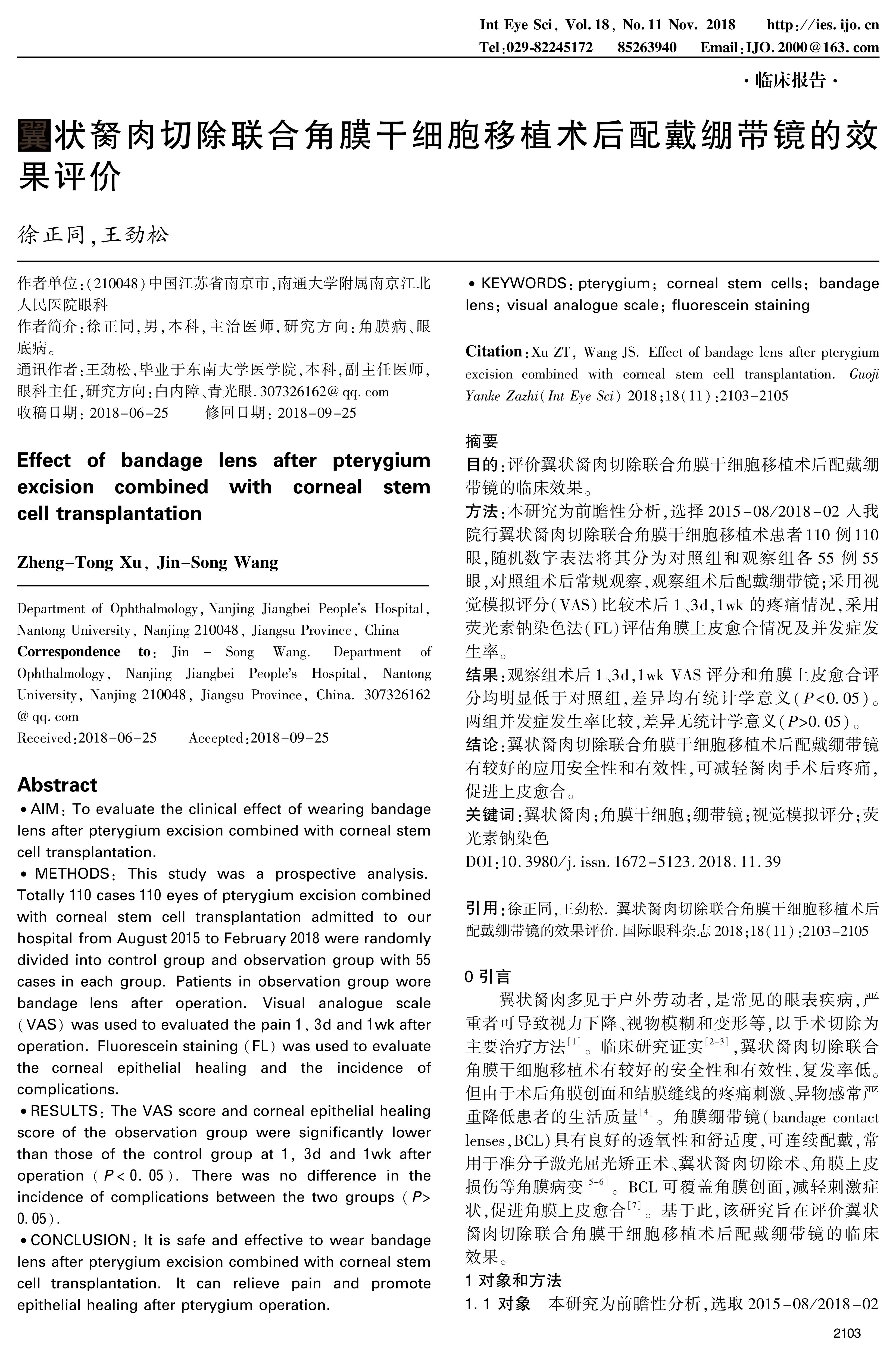 CONCLUSION: It is safe and effective to wear bandage lens after pterygium excision combined with corneal stem cell transplantation. It can relieve pain and promote epithelial healing after pterygium operation.