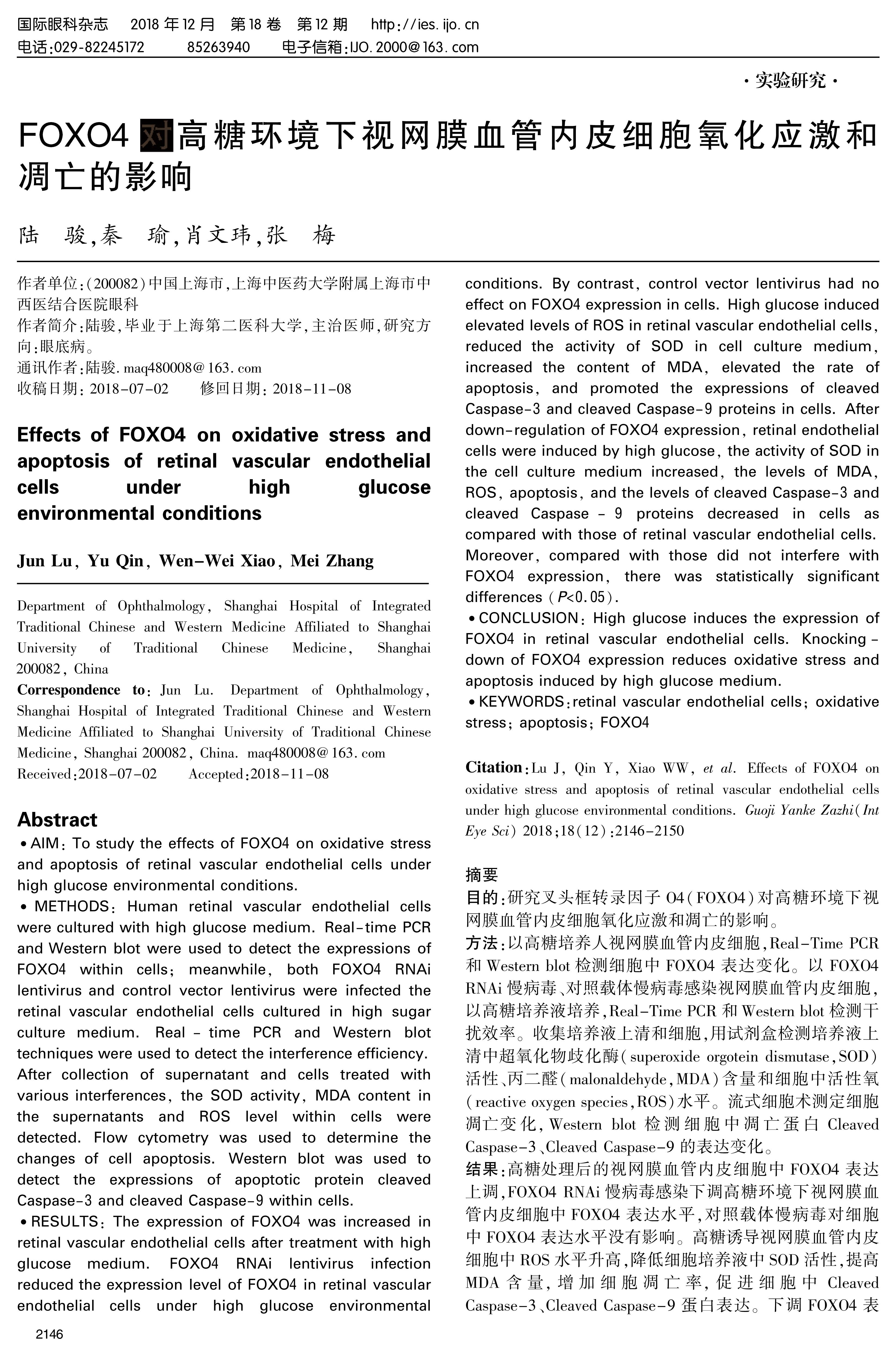 RESULTS: The expression of FOXO4 was increased in retinal vascular endothelial cells after treatment with high glucose medium. FOXO4 RNAi lentivirus infection reduced the expression level of FOXO4 in retinal vascular endothelial cells under high glucose environmental conditions. By contrast, control vector lentivirus had no effect on FOXO4 expression in cells. High glucose induced elevated levels of ROS in retinal vascular endothelial cells, reduced the activity of SOD in cell culture medium, increased the content of MDA, elevated the rate of apoptosis, and promoted the expressions of cleaved Caspase-3 and cleaved Caspase-9 proteins in cells. After down-regulation of FOXO4 expression, retinal endothelial cells were induced by high glucose, the activity of SOD in the cell culture medium increased, the levels of MDA, ROS, apoptosis, and the levels of cleaved Caspase-3 and cleaved Caspase-9 proteins decreased in cells as compared with those of retinal vascular endothelial cells. Moreover, compared with those did not interfere with FOXO4 expression, there was statistically significant differences(P<0.05).