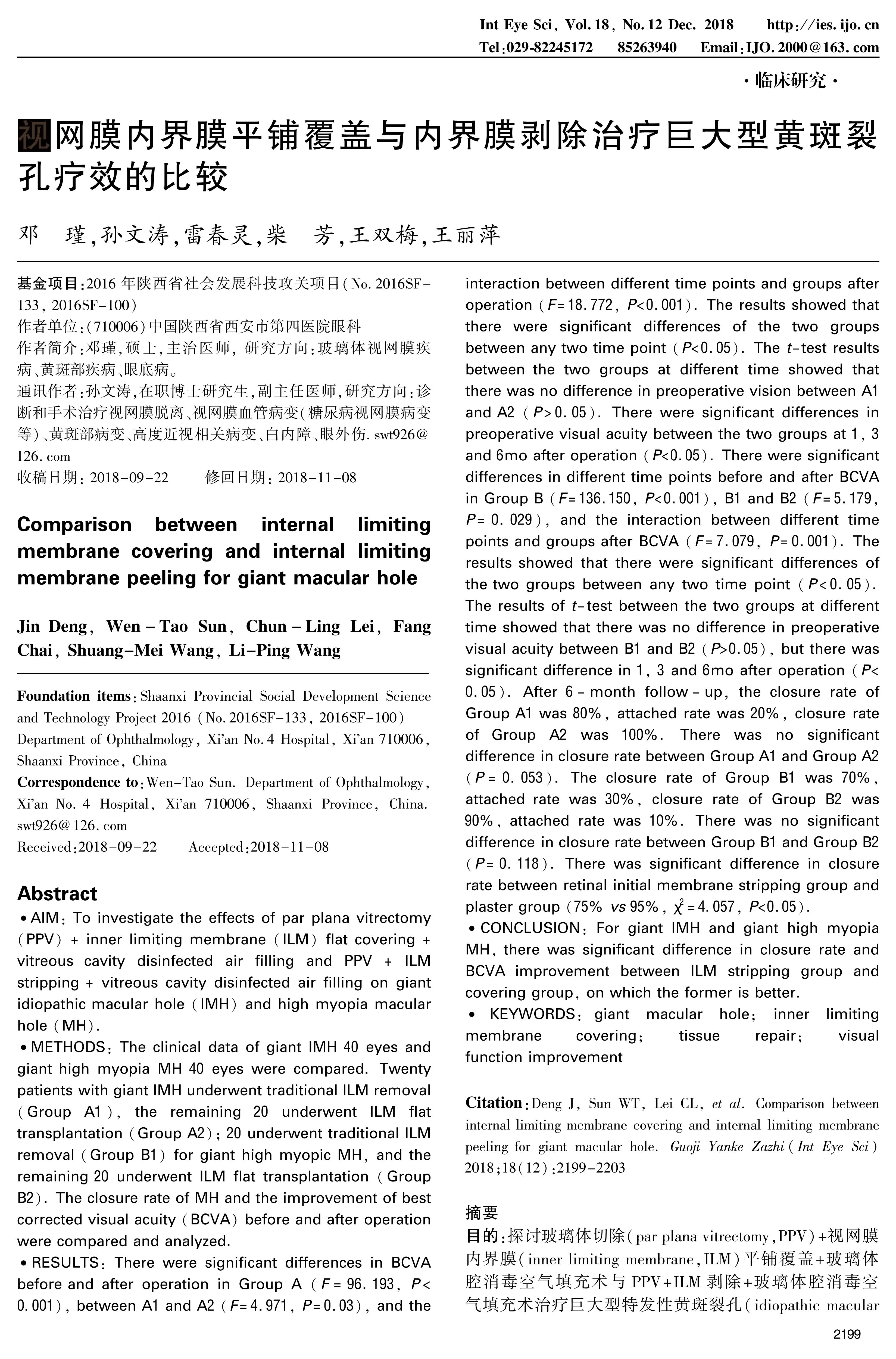 结论:对于巨大型IMH和巨大型高度近视MH患者,ILM平铺覆盖治疗组在闭合率及BCVA提高上明显优于ILM剥除组。