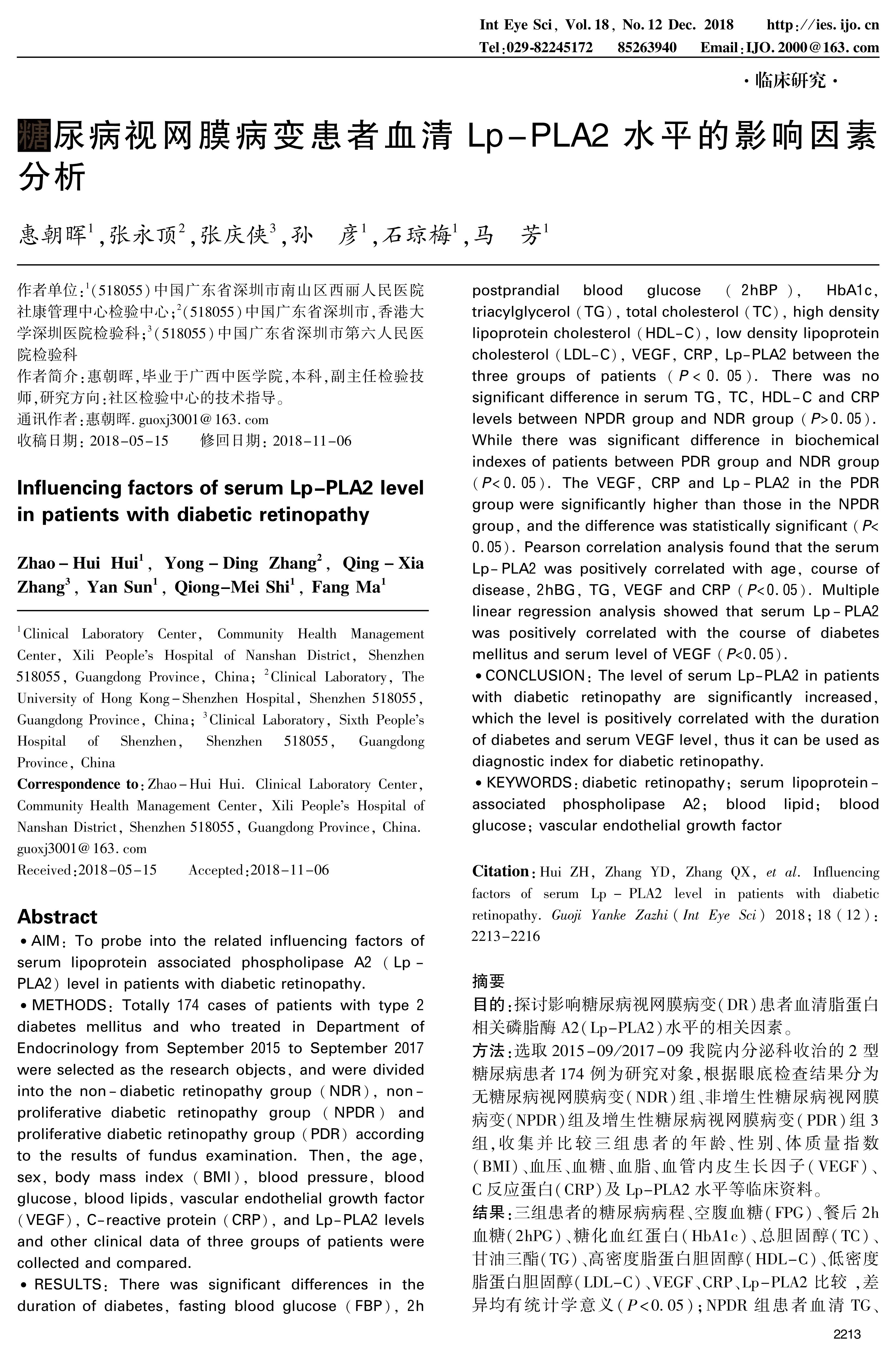 RESULTS: There was significant differences in the duration of diabetes, fasting blood glucose(FBP), 2h postprandial blood glucose(2hBP), HbA1c, triacylglycerol(TG), total cholesterol(TC), high density lipoprotein cholesterol(HDL-C), low density lipoprotein cholesterol(LDL-C), VEGF, CRP, Lp-PLA2 between the three groups of patients(P<0.05). There was no significant difference in serum TG, TC, HDL-C and CRP levels between NPDR group and NDR group(P>0.05). While there was significant difference in biochemical indexes of patients between PDR group and NDR group(P<0.05). The VEGF, CRP and Lp-PLA2 in the PDR group were significantly higher than those in the NPDR group, and the difference was statistically significant(P<0.05). Pearson correlation analysis found that the serum Lp-PLA2 was positively correlated with age, course of disease, 2hBG, TG, VEGF and CRP(P<0.05). Multiple linear regression analysis showed that serum Lp-PLA2 was positively correlated with the course of diabetes mellitus and serum level of VEGF(P<0.05).