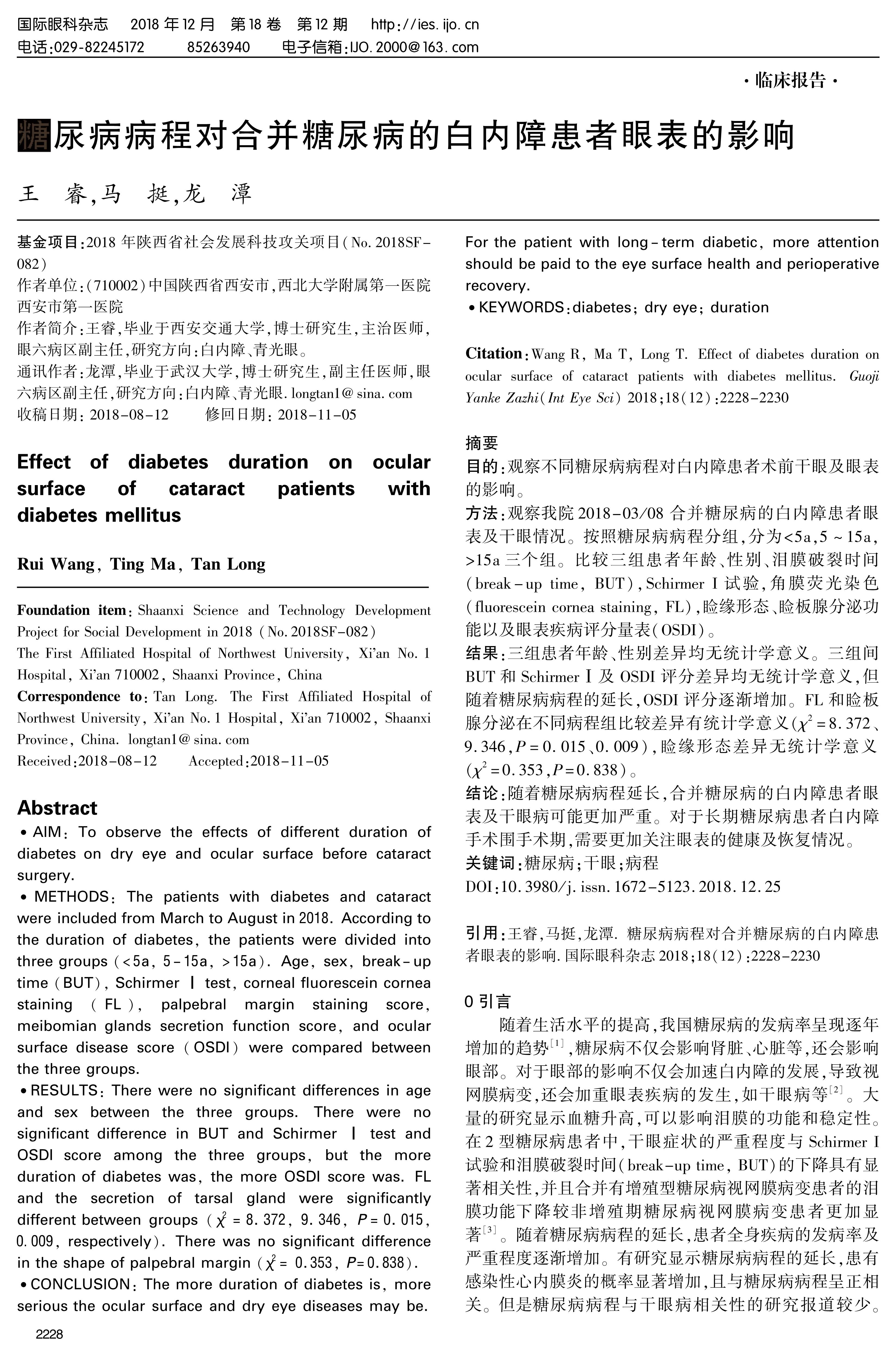 CONCLUSION: The more duration of diabetes is, more serious the ocular surface and dry eye diseases may be. For the patient with long-term diabetic, more attention should be paid to the eye surface health and perioperative recovery.