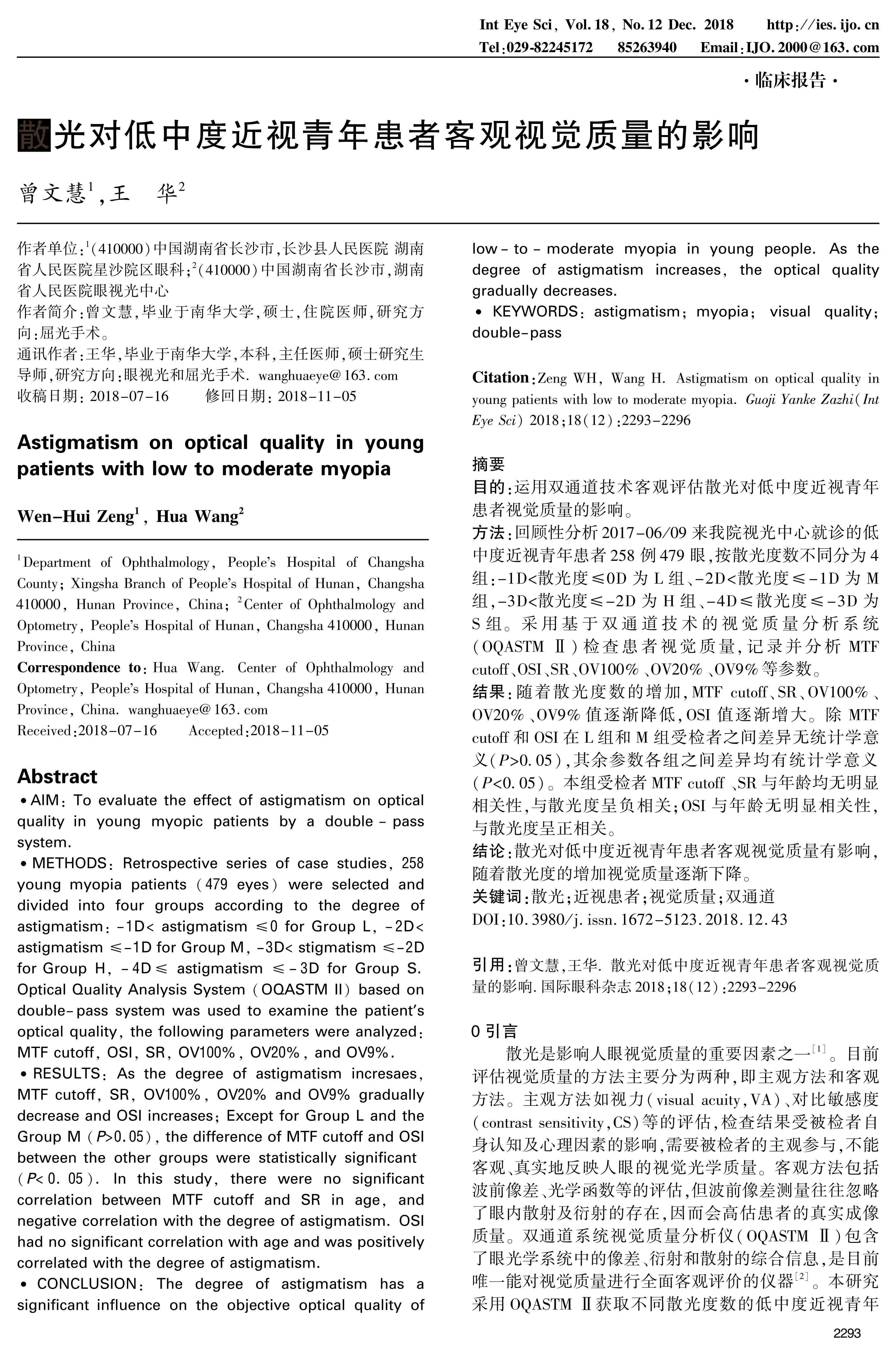 目的:运用双通道技术客观评估散光对低中度近视青年患者视觉质量的影响。