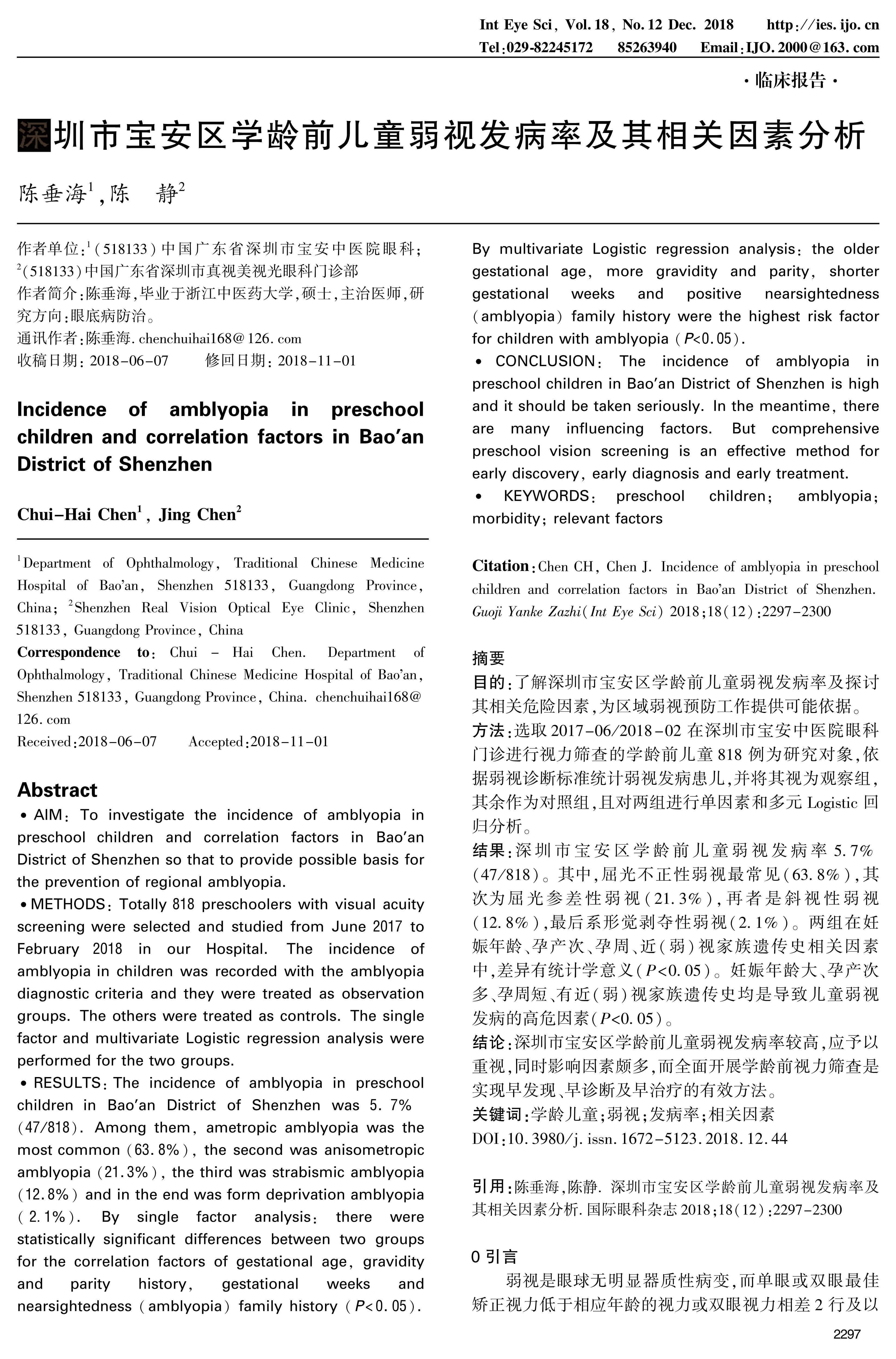 RESULTS:The incidence of amblyopia in preschool children in Bao'an District of Shenzhen was 5.7%(47/818). Among them, ametropic amblyopia was the most common(63.8%), the second was anisometropic amblyopia(21.3%), the third was strabismic amblyopia(12.8%)and in the end was form deprivation amblyopia(2.1%). By single factor analysis: there were statistically significant differences between two groups for the correlation factors of gestational age, gravidity and parity history, gestational weeks and nearsightedness(amblyopia)family history(P<0.05). By multivariate Logistic regression analysis: the older gestational age, more gravidity and parity, shorter gestational weeks and positive nearsightedness(amblyopia)family history were the highest risk factor for children with amblyopia(P<0.05).
