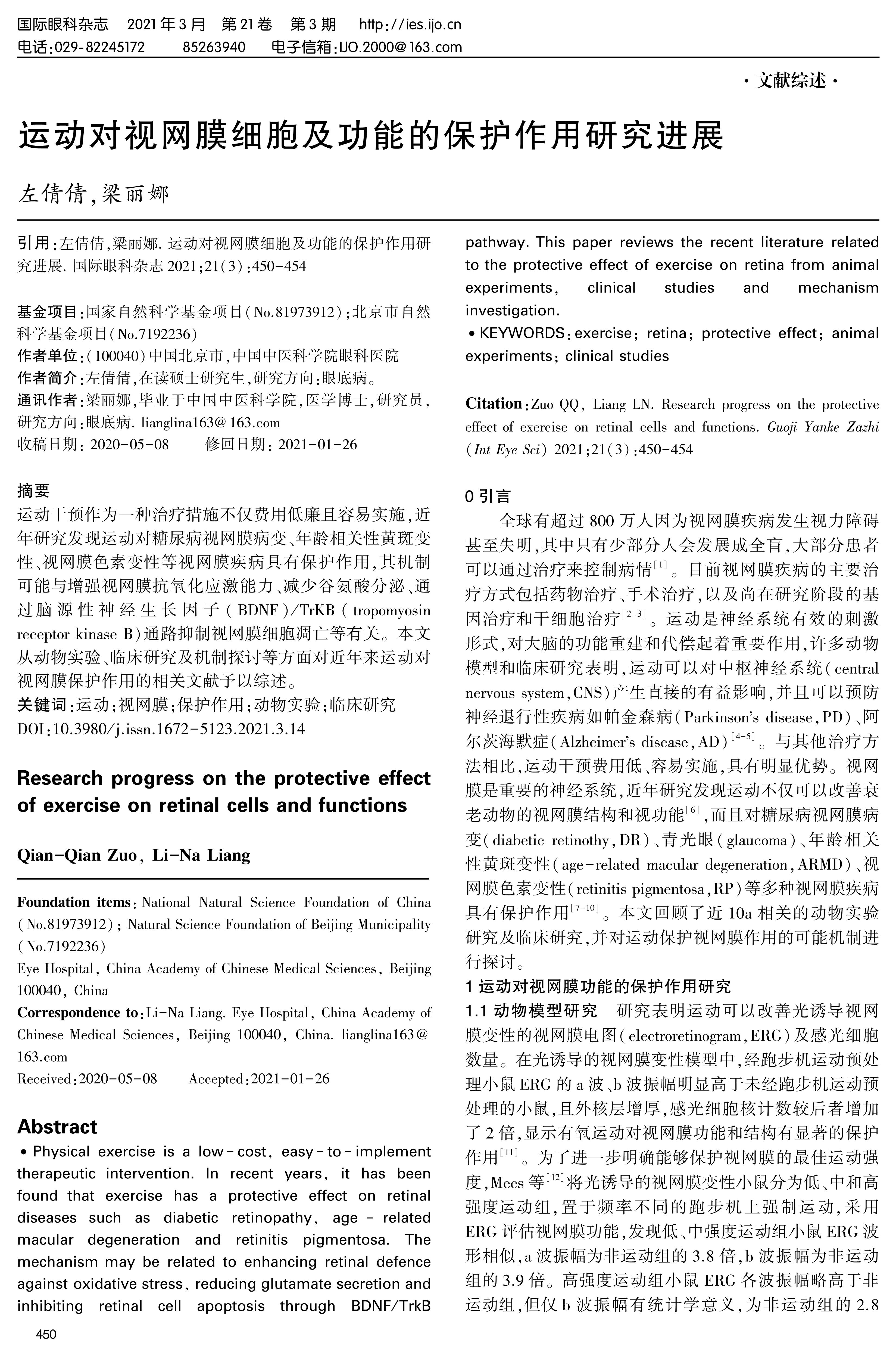 运动干预作为一种治疗措施不仅费用低廉且容易实施,近年研究发现运动对糖尿病视网膜病变、年龄相关性黄斑变性、视网膜色素变性等视网膜疾病具有保护作用,其机制可能与增强视网膜抗氧化应激能力、减少谷氨酸分泌、通过脑源性神经生长因子(BDNF)/TrKB(tropomyosin receptor kinase B)通路抑制视网膜细胞凋亡等有关。本文从动物实验、临床研究及机制探讨等方面对近年来运动对视网膜保护作用的相关文献予以综述。