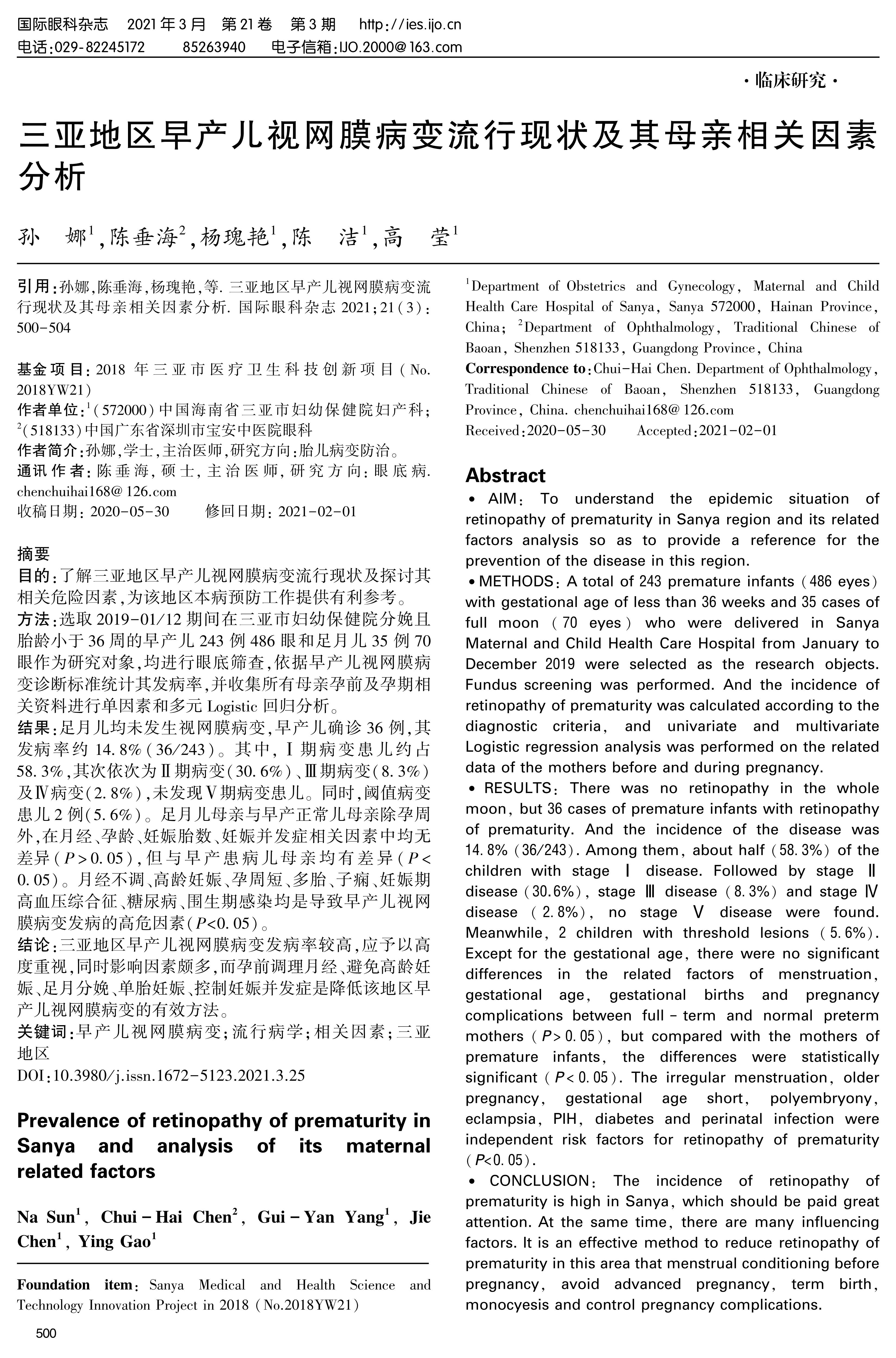 METHODS: A total of 243 premature infants(486 eyes)with gestational age of less than 36 weeks and 35 cases of full moon(70 eyes)who were delivered in Sanya Maternal and Child Health Care Hospital from January to December 2019 were selected as the research objects. Fundus screening was performed. And the incidence of retinopathy of prematurity was calculated according to the diagnostic criteria, and univariate and multivariate Logistic regression analysis was performed on the related data of the mothers before and during pregnancy.