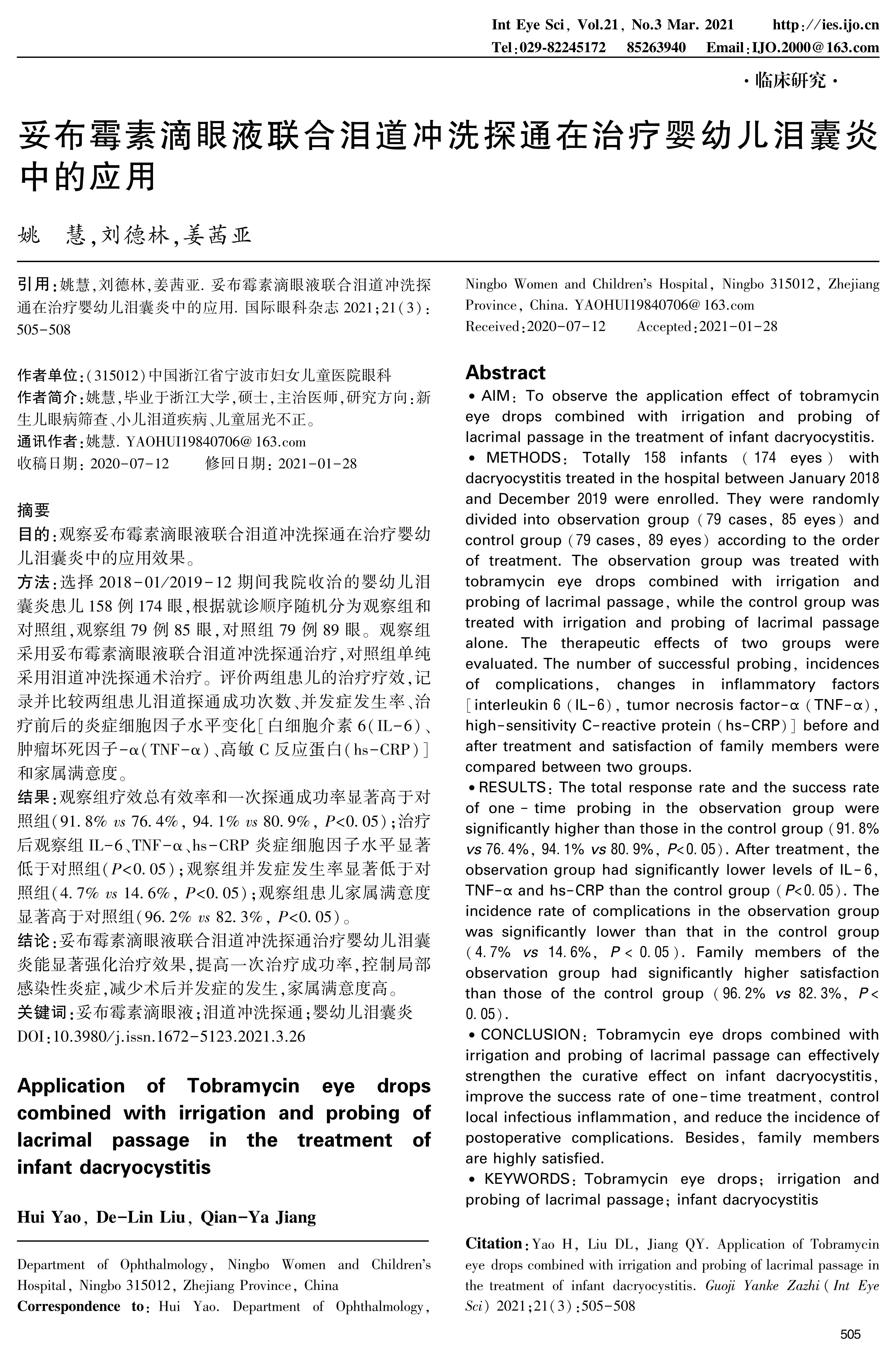 CONCLUSION: Tobramycin eye drops combined with irrigation and probing of lacrimal passage can effectively strengthen the curative effect on infant dacryocystitis, improve the success rate of one-time treatment, control local infectious inflammation, and reduce the incidence of postoperative complications. Besides, family members are highly satisfied.