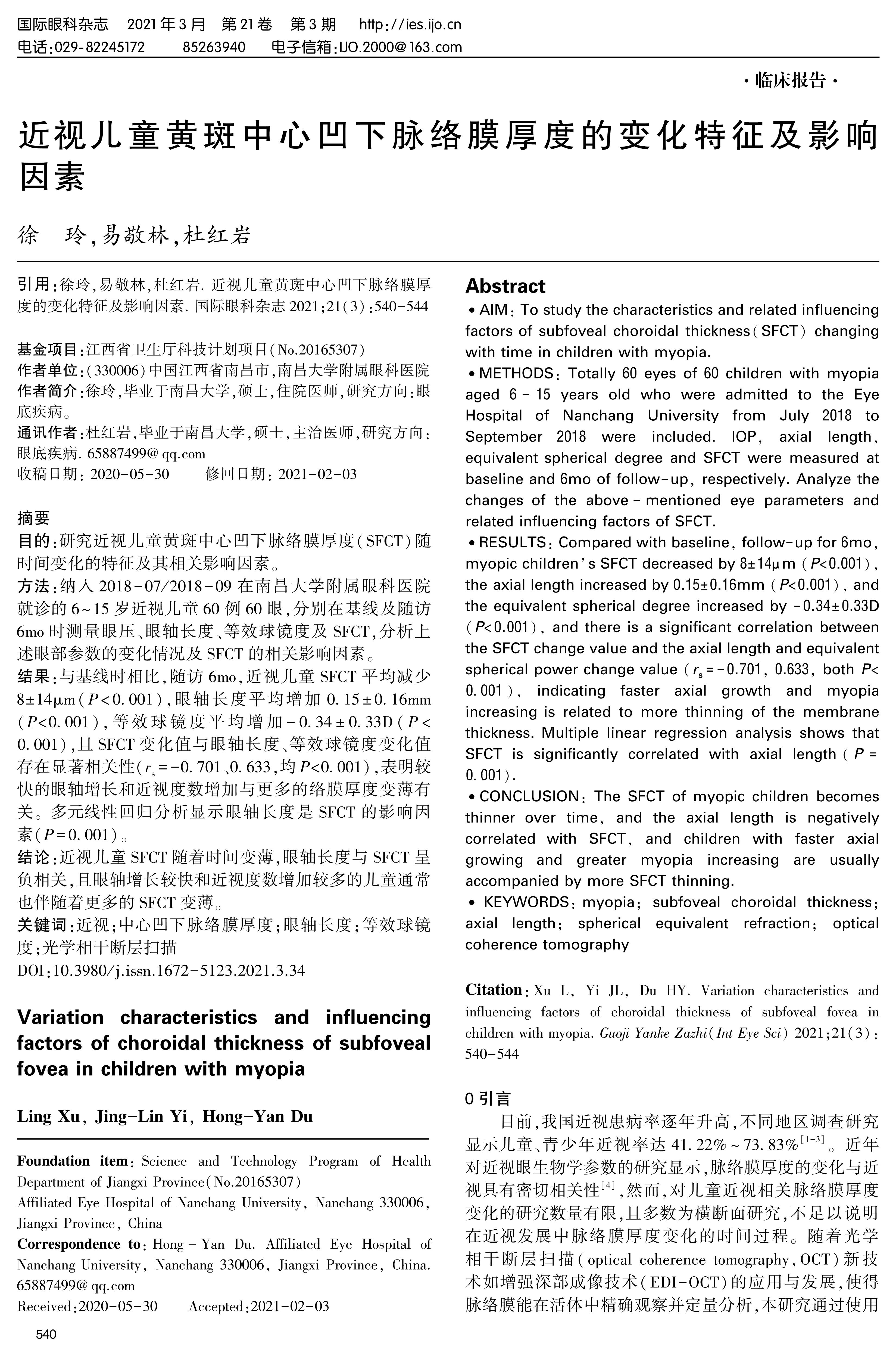 方法:纳入2018-07/2018-09在南昌大学附属眼科医院就诊的6~15岁近视儿童60例60眼,分别在基线及随访6mo时测量眼压、眼轴长度、等效球镜度及SFCT,分析上述眼部参数的变化情况及SFCT的相关影响因素。
