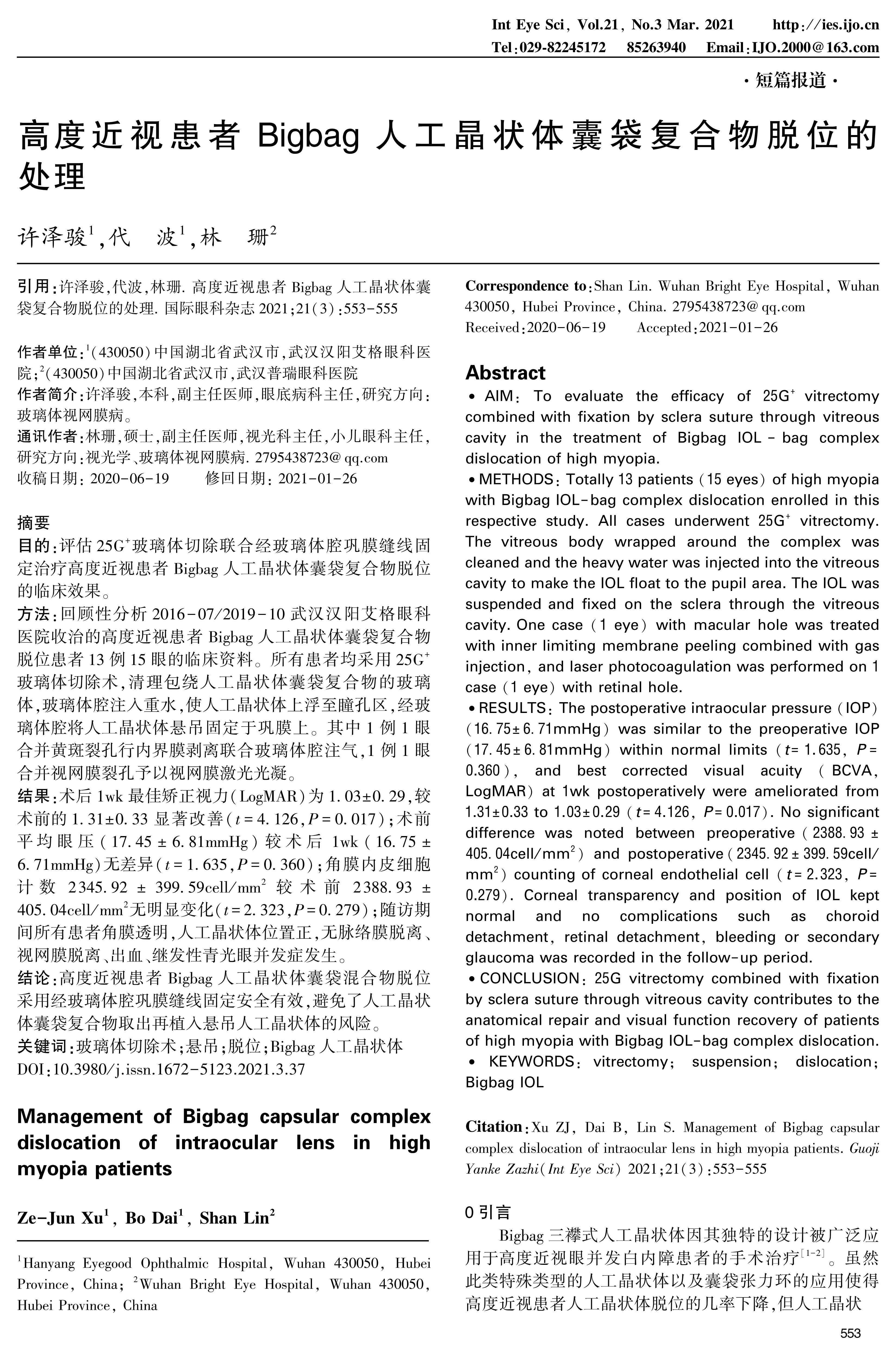 结论:高度近视患者Bigbag人工晶状体囊袋混合物脱位采用经玻璃体腔巩膜缝线固定安全有效,避免了人工晶状体囊袋复合物取出再植入悬吊人工晶状体的风险。
