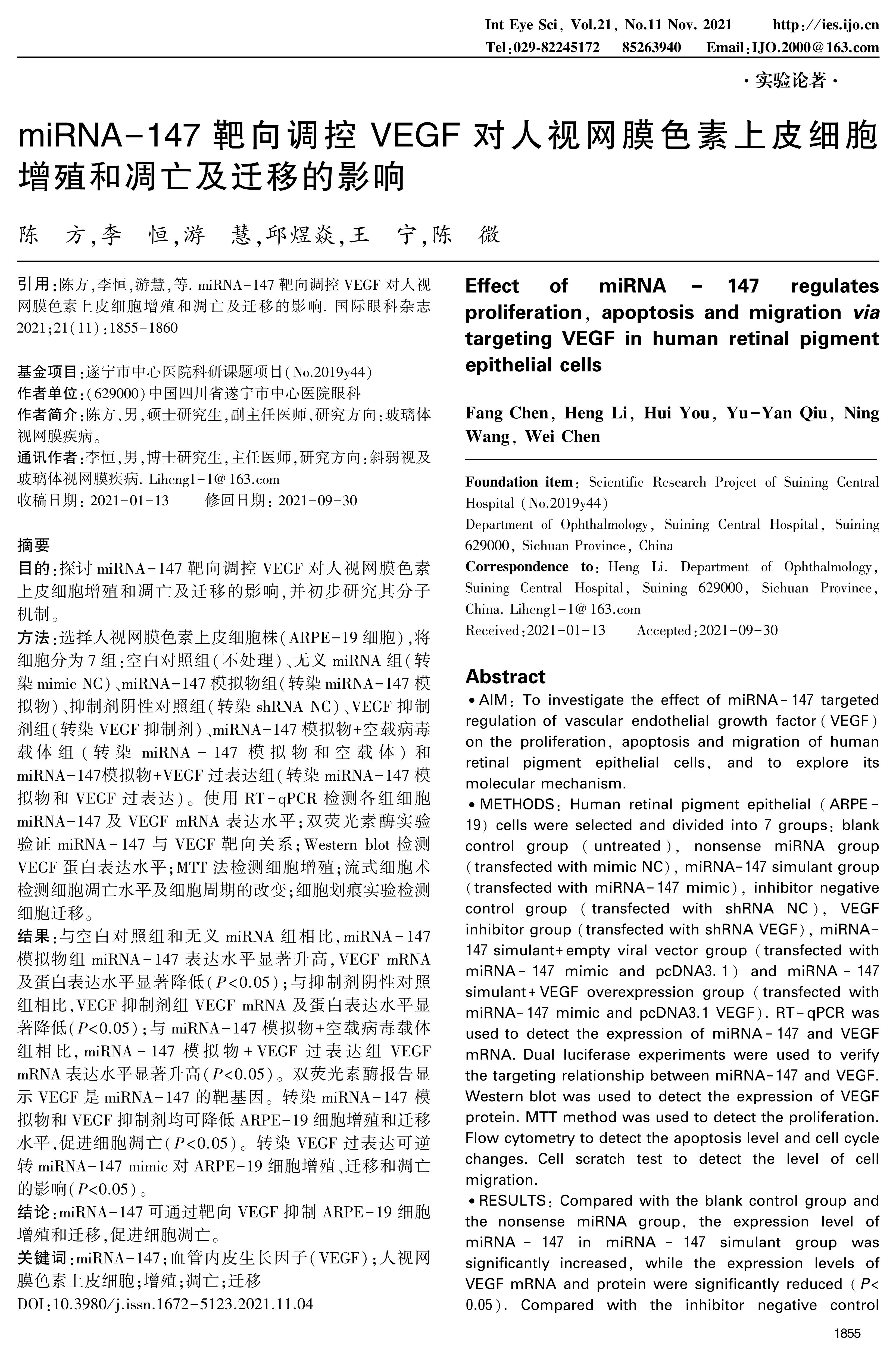 AIM: To investigate the effect of miRNA-147 targeted regulation of vascular endothelial growth factor(VEGF)on the proliferation, apoptosis and migration of human retinal pigment epithelial cells, and to explore its molecular mechanism. METHODS: Human retinal pigment epithelial(ARPE-19)cells were selected and divided into 7 groups: blank control group(untreated), nonsense miRNA group(transfected with mimic NC), miRNA-147 simulant group(transfected with miRNA-147 mimic), inhibitor negative control group(transfected with shRNA NC), VEGF inhibitor group(transfected with shRNA VEGF), miRNA-147 simulant+empty viral vector group(transfected with miRNA-147 mimic and pcDNA3.1)and miRNA-147 simulant+VEGF overexpression group(transfected with miRNA-147 mimic and pcDNA3.1 VEGF). RT-qPCR was used to detect the expression of miRNA-147 and VEGF mRNA. Dual luciferase experiments were used to verify the targeting relationship between miRNA-147 and VEGF. Western blot was used to detect the expression of VEGF protein. MTT method was used to detect the proliferation. Flow cytometry to detect the apoptosis level and cell cycle changes. Cell scratch test to detect the level of cell migration. RESULTS: Compared with the blank control group and the nonsense miRNA group, the expression level of miRNA-147 in miRNA-147 simulant group was significantly increased, while the expression levels of VEGF mRNA and protein were significantly reduced(P<0.05). Compared with the inhibitor negative control group, the expression levels of VEGF mRNA and protein in the VEGF inhibitor group were significantly reduced(P<0.05). Compared with the miRNA-147 simulant+empty viral vector group, the expression level of VEGF mRNA in the miRNA-147 simulant+VEGF overexpression group was significantly increased(P<0.05). The dual luciferase report shows that VEGF is the target gene of miRNA-147. Transfection of miRNA-147 mimic and shRNA VEGF can reduce the proliferation and migration of ARPE-19 cells and promote apoptosis can reduce the proliferation and migration of ARPE-19 cells and promote apoptosis(P<0.05). Transfection VEGF overexpression reverses the effect of miRNA-147 mimics on proliferation, migration and apoptosis of ARPE-19 cells(P<0.05). CONCLUSION: miRNA-147 can inhibit ARPE-19 cell proliferation, migration and promote cell apoptosis by targeting VEGF.