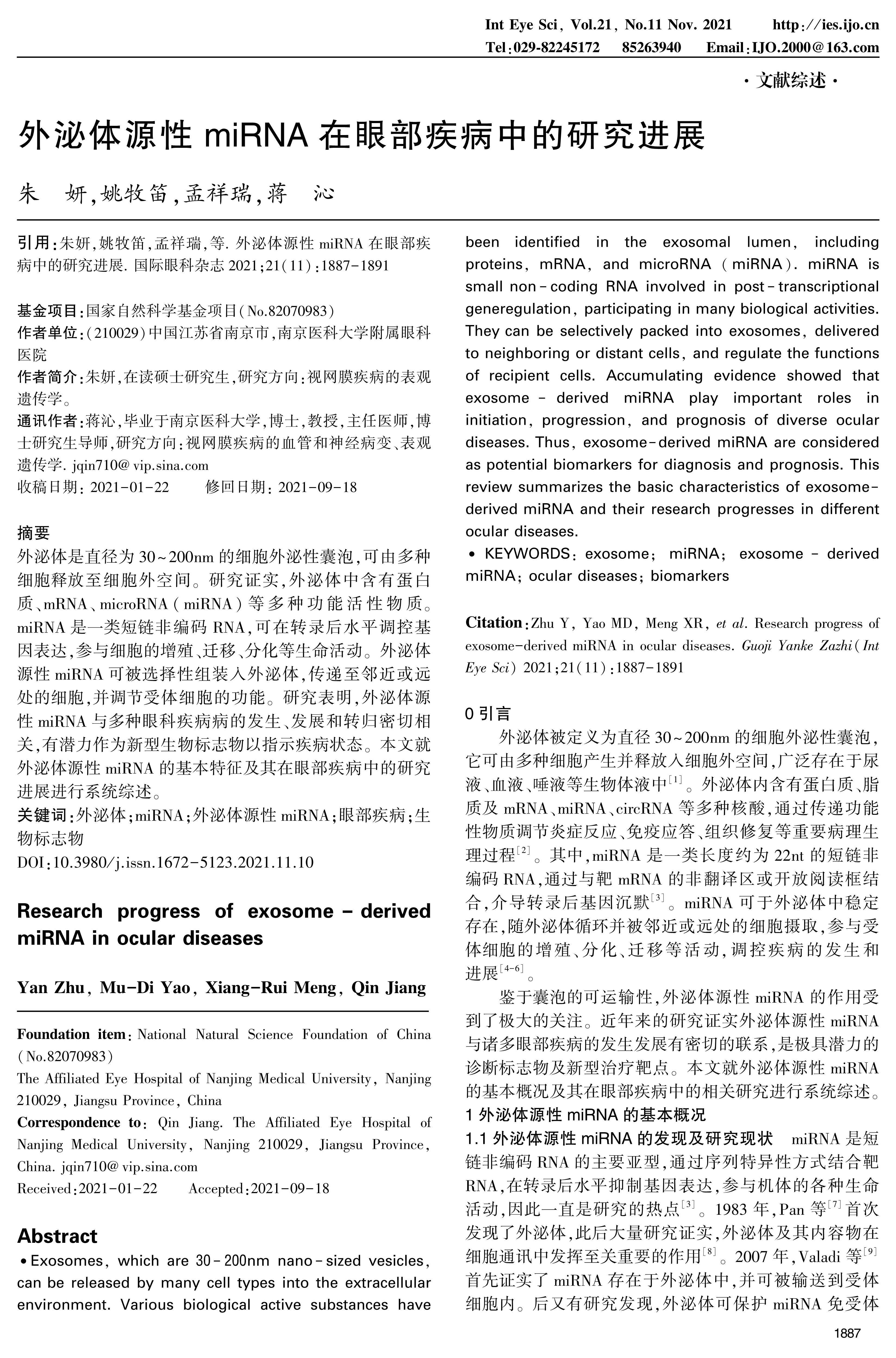 外泌体是直径为30~200nm的细胞外泌性囊泡,可由多种细胞释放至细胞外空间。研究证实,外泌体中含有蛋白质、mRNA、microRNA(miRNA)等多种功能活性物质。miRNA是一类短链非编码RNA,可在转录后水平调控基因表达,参与细胞的增殖、迁移、分化等生命活动。外泌体源性miRNA可被选择性组装入外泌体,传递至邻近或远处的细胞,并调节受体细胞的功能。研究表明,外泌体源性miRNA与多种眼科疾病病的发生、发展和转归密切相关,有潜力作为新型生物标志物以指示疾病状态。本文就外泌体源性miRNA的基本特征及其在眼部疾病中的研究进展进行系统综述。